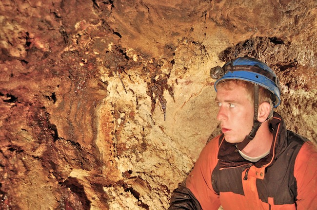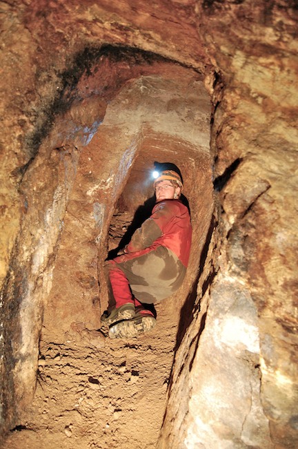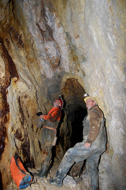![]() Sehr schöne Sinterbildungen an der Firste laden zur weiteren Befahrung ein! |