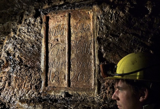 ![]() Das gewaltige Gewölbe verläuft im Bereich der Muldenquerung des Streckenflügels und mittels einer Tafel ist die Mitte der Freiberger Mulde markiert. (Foto: G. Voigt) |