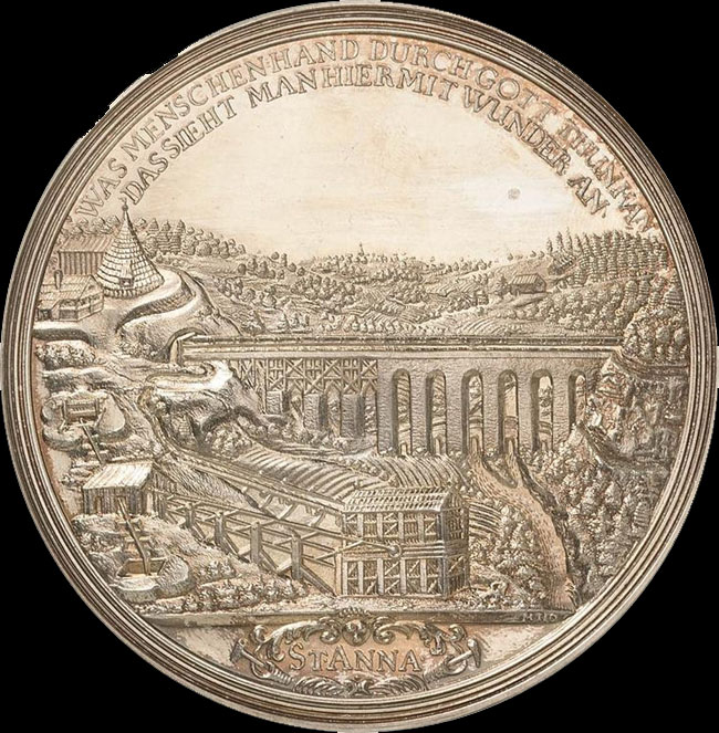 Die Erbauung dieses Theils der Brücke fällt in das 17. Jahrhundert, und zwar in dessen zweite Hälfte. Daß derselbe vor dem Jahre 1690 errichtet worden ist, geht aus einer Abbildung der Brücke auf einer im gedachten Jahre geprägten Ausbeutemünze hervor, welche die Grube »St. Anna" zu Rothenfurth in diesem Jahre an ihre Gewerken vertheilte, nachdem ihr solches mittelst kurfürstlichen Befehls vom 23. November 1690 — und zwar in der Erwägung, „daß ein dergleichen Stück dem Freybergischen Bergwerke zum sonderbaren Ruhme gereichen müsse" — gestattet worden war. Eine Abbildung hiervon befindet sich auf Tafel I. Die Schauseite dieser Münze enthält eine Ansicht des Bauwerks, welche deutlich die fertiggestellten sechs Bögen, sowie weiter erkennen läßt, daß die Leitung des Wassers von der Brücke nach den Grubengebäuden damals auf Holzböcken erfolgte, von welchen eine Anzahl wieder durch Steinpfeiler in der Stärke der Brückenpfeiler, indeß von wesentlich geringerer Höhe als diese getragen wurde. Bei der Naivität dieser Darstellung darf man sich freilich hinsichtlich der Einzelheiten des Baues nicht auf sie verlassen. So ist, um die Tagegebäude des Beigewerks mit abbilden zu können, die Entfernung vorn südlichen Muldengehänge bis zu den Grubengebäuden im Verhältniß zum Höhenmaße mindestens um drei Viertel zu kurz gezeichnet, und zwar ist allem Anscheine nach die Länge der steinernen sechs Brückenbögen weniger verkürzt als die Länge des Brückentheils, welcher aus Holzgerüst bestand. Bei diesem ist ohne Zweifel die Mehrzahl der Holzböcke, und zwar auch ein Theil derjenigen, welche auf Steinpfeilern ruhten, gar nicht mit zur Darstellung gekommen.