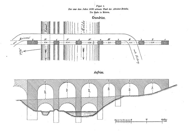 ![]() Vielleicht das letzte Bilddokument vor ihrer Sprengung: Blick vom rechten Muldeufer nach Südosten auf die Altväterbrücke. Foto: Paul Schulz, vor 1895.