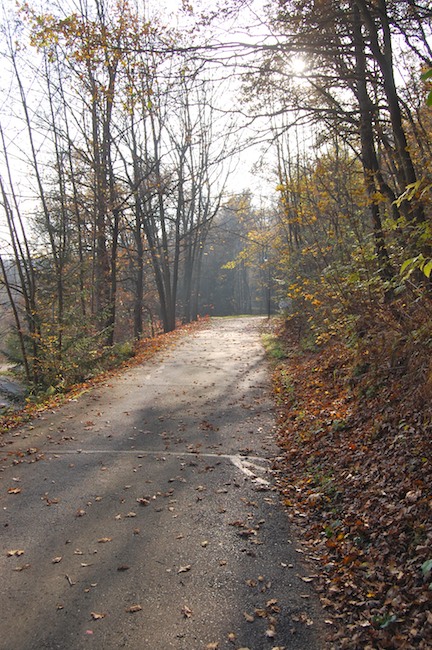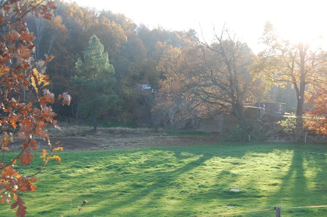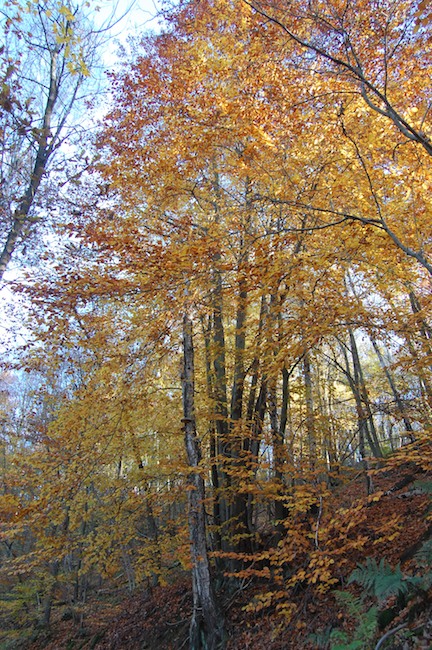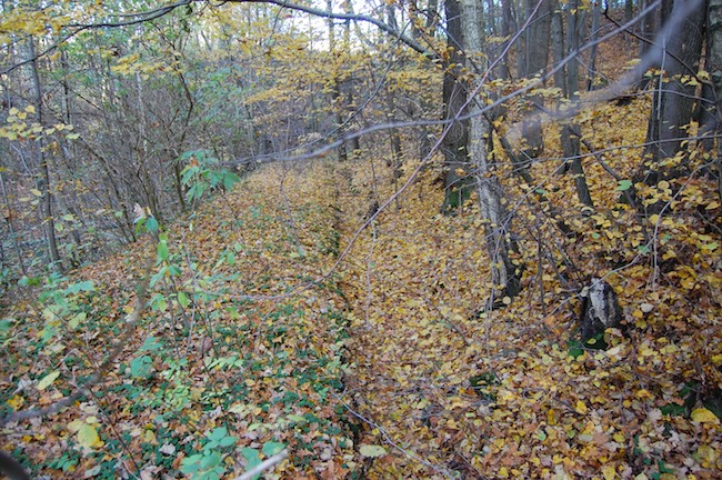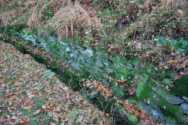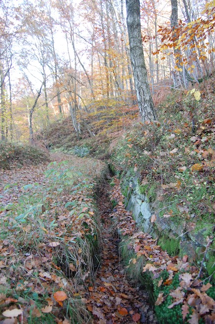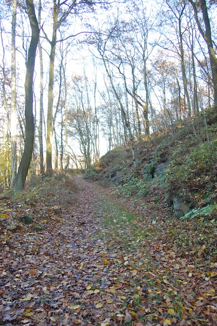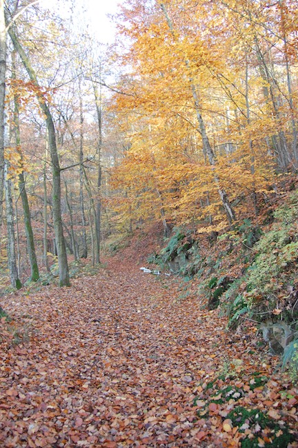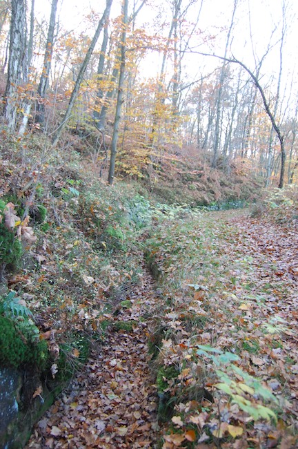 ![]() Blick zurück. Außer dem schönen Herbstfarben ist hier nichts mehr von einem ehemaligen Kunstgraben zu sehen. Nur der ziemlich "horizontale" Verlauf des Weges am Hang entlang weist noch auf seinen Ursprung hin. Das Röschenmundloch lag auf dem Grundstück der Tischlerei Müller. |