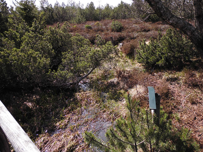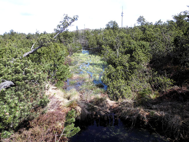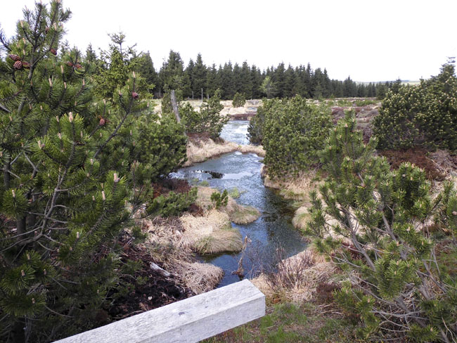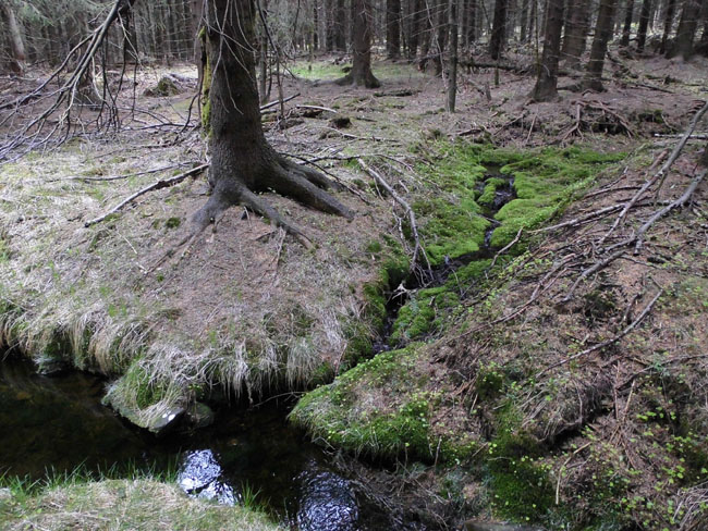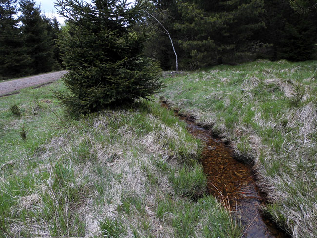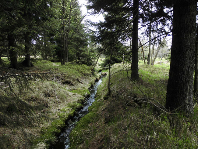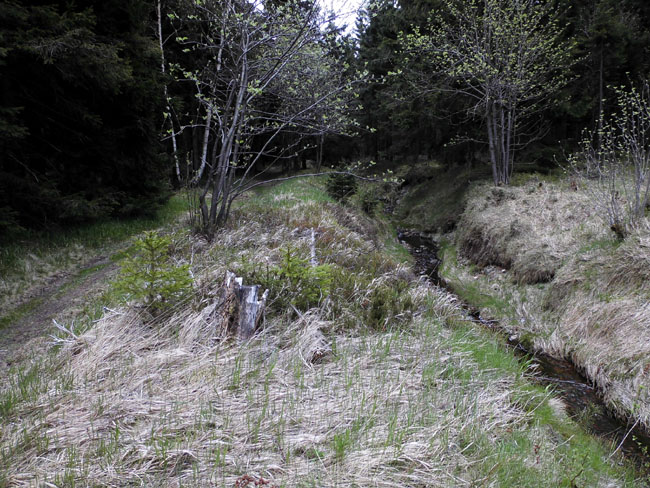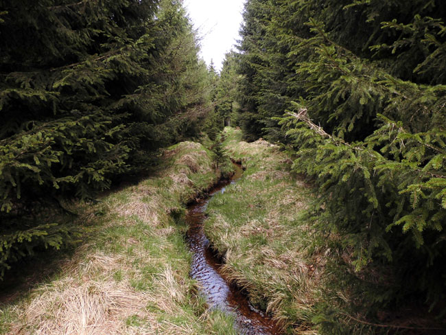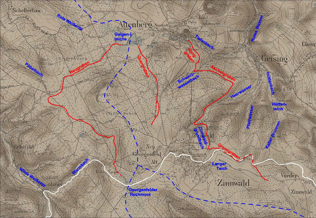 Erstes Ziel erreicht: Ausgehend von etwa 877 m Höhe am Georgenfelder Hochmoor haben wir jetzt nach gefühlten 15 km den Neugraben abwärts dessen Einmündung in den Großen Galgenteich auf zirka 787 m Höhe über dem Meer erreicht. (Es sind tatsächlich "nur" rund 7,4 km, aber wir sind ja viel im Zick-Zack gelaufen, um erstmal den Anfang zu finden…) |
