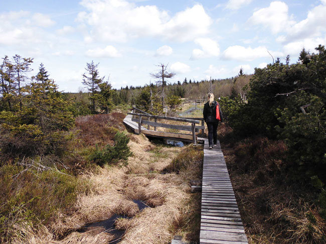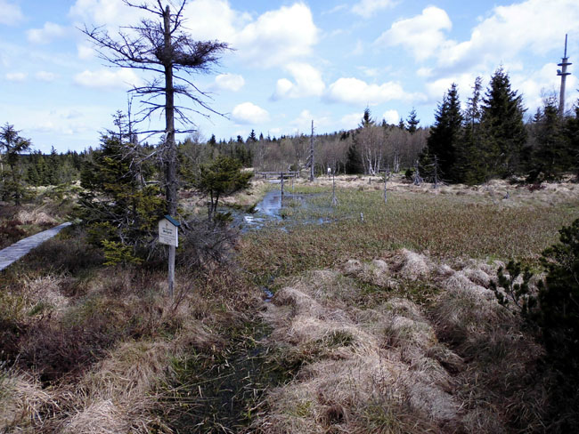 Bis hierher sind es erstmal nur rund 300 m: Der Eingang zum Georgenfelder Hochmoor. Laut Beschilderung sind wir hier rund 877 m über dem Meer. Der Rundweg durch´s Moor ist rund 1,2 km lang und die 2,30 € Eintritt sind der Besuch allemal wert. |