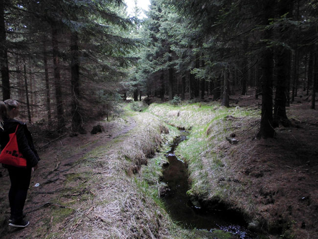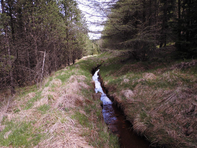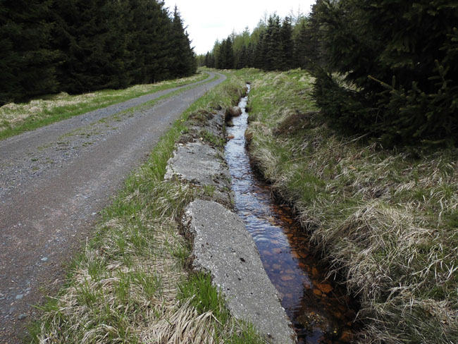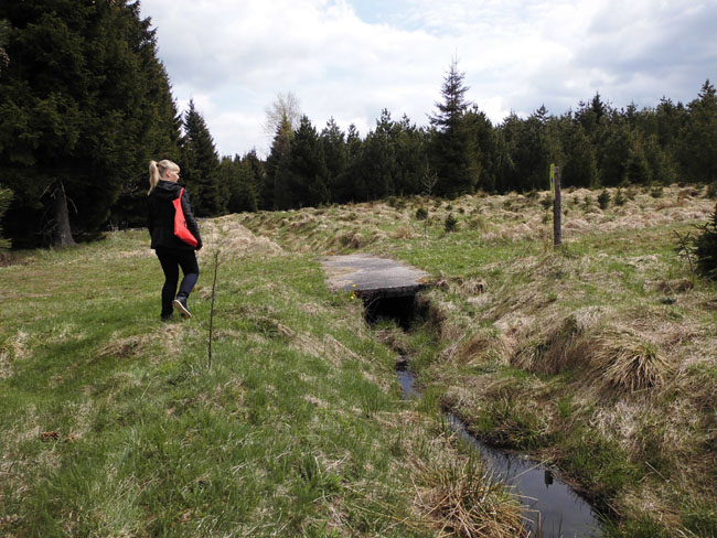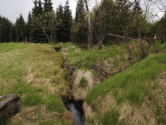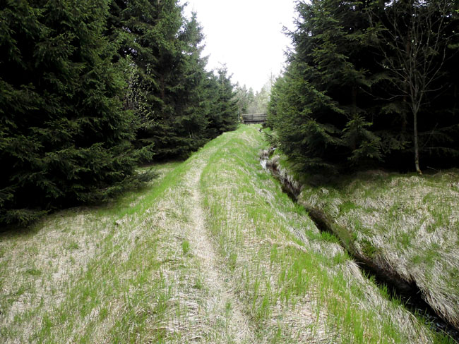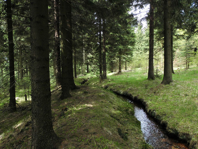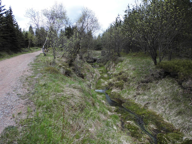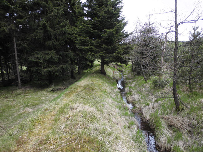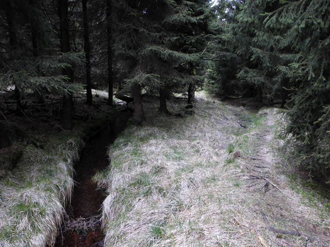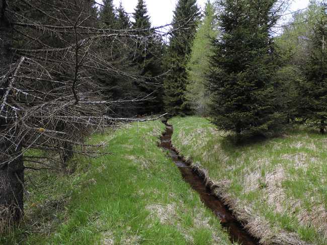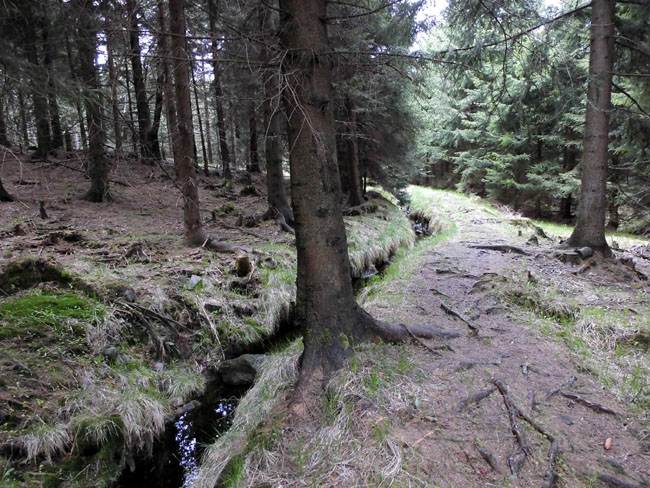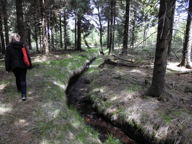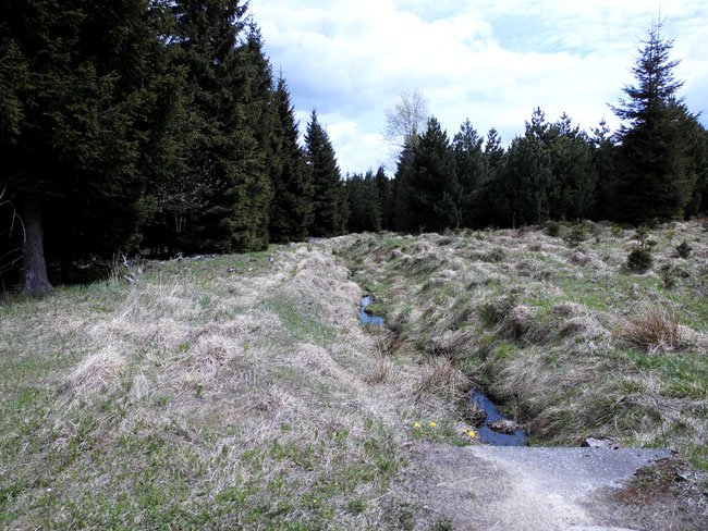 Die Hänge zwischen Kahleberg und Lugsteinen sind ziemlich sumpfig. Hier wurde vor kurzem der Grabenverlauf gereinigt. So könnten die manchmal zu groß erscheinenden „Dämme“ entstanden sein. |