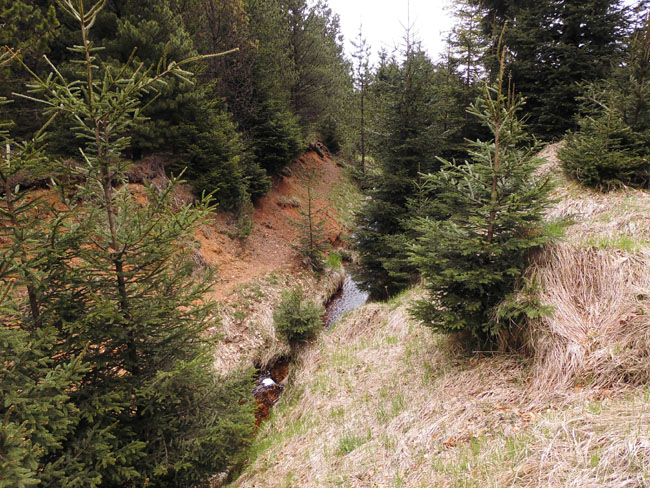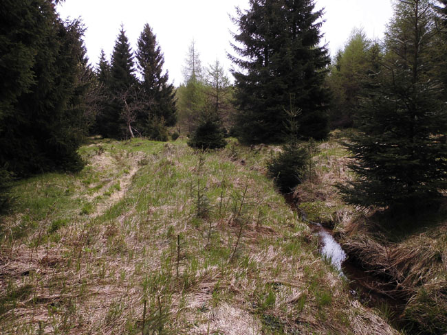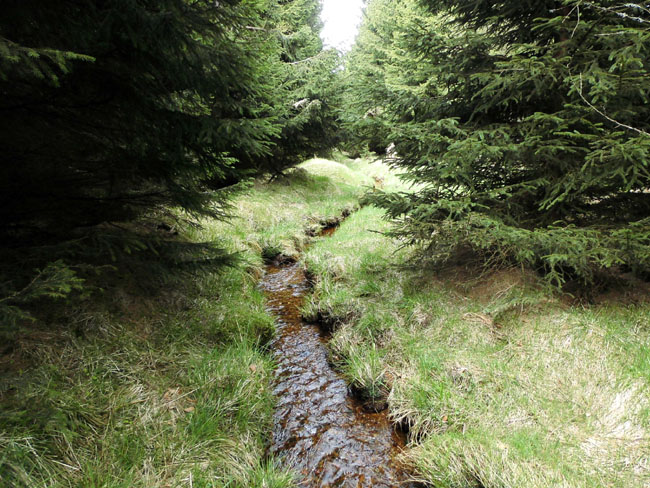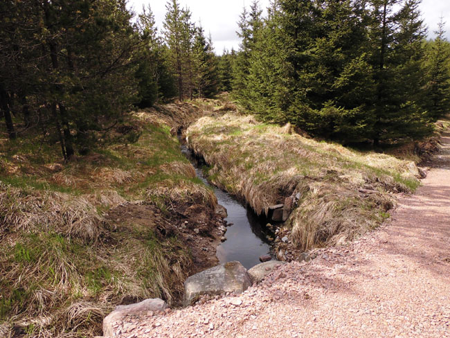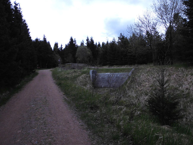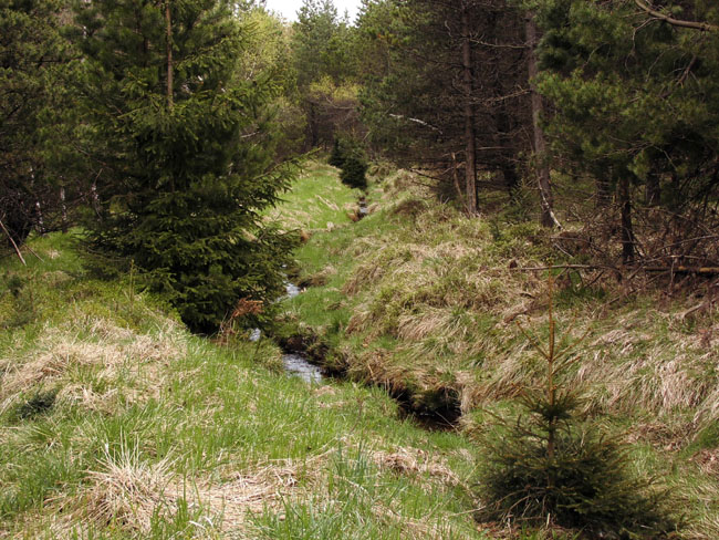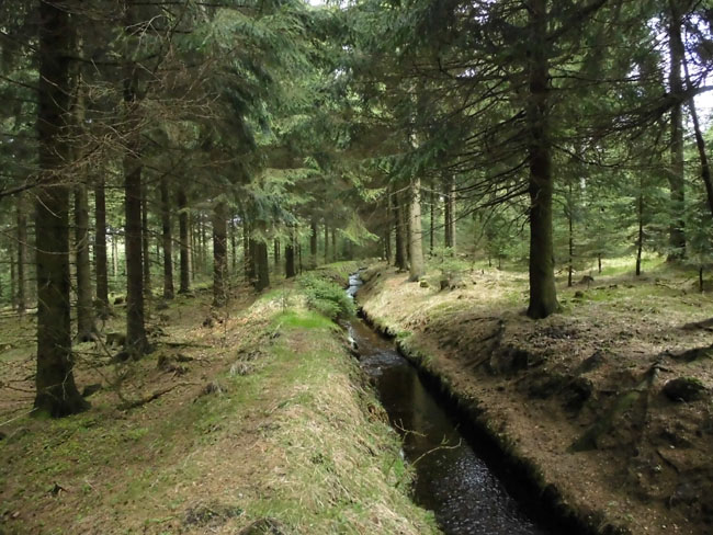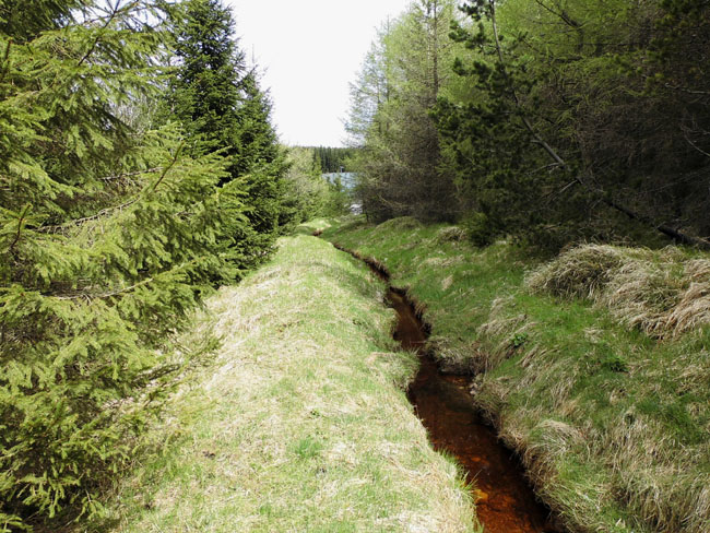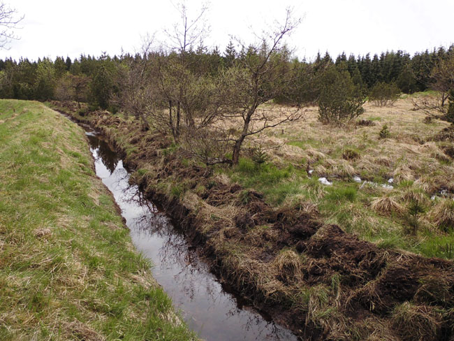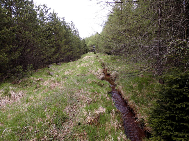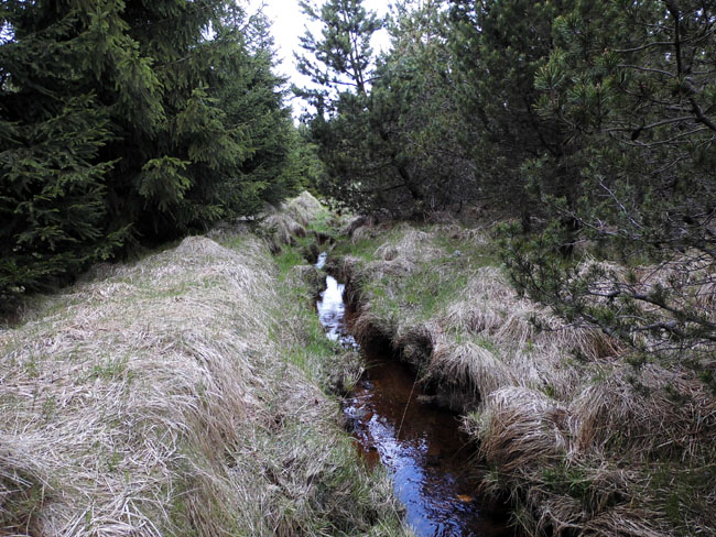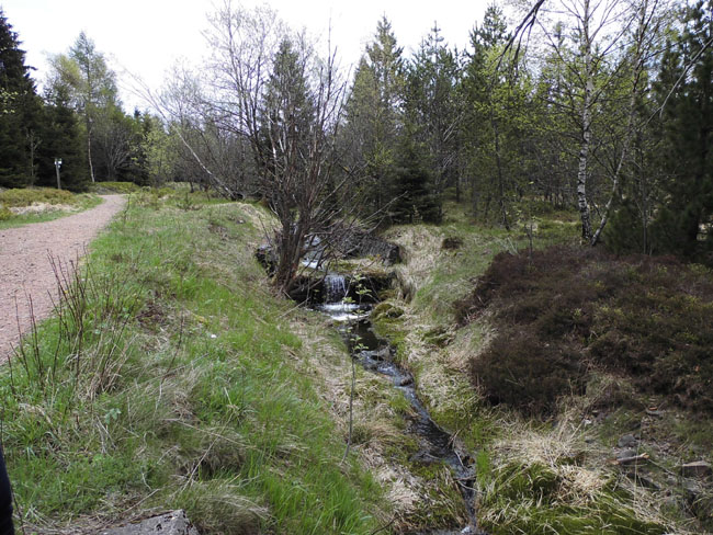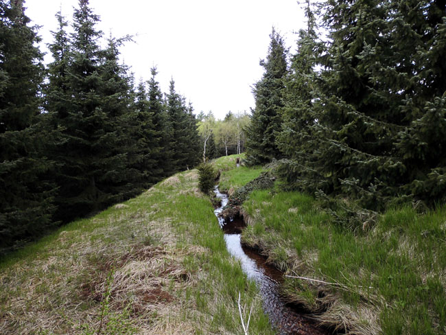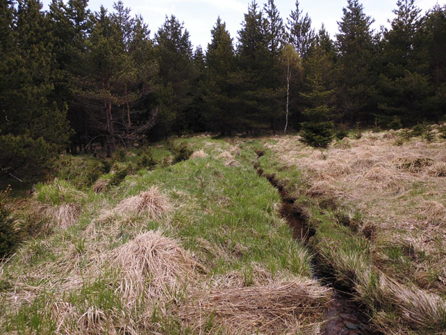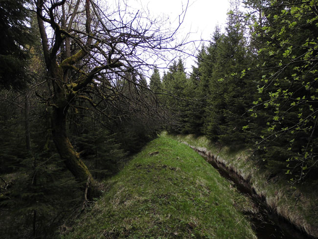Die Hänge zwischen Kahleberg und Lugsteinen sind ziemlich sumpfig. Hier wurde vor kurzem der Grabenverlauf gereinigt. So könnten die manchmal zu groß erscheinenden „Dämme“ entstanden sein. |