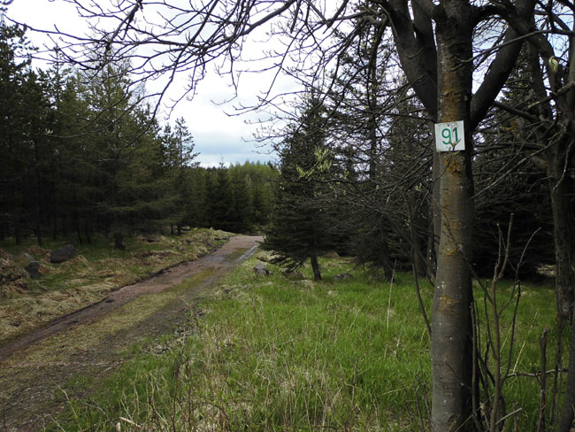 Man muß wieder raus aus dem Moor und dem Hauptweg in Richtung Schneise 28 folgen. Die Nummer dieses Jagens westlich der Schneise stimmt noch immer mit der Karte von 1880 überein – guter Orientierungspunkt. Hier geht der Weg geradeaus und nach rechts zweigt die Schneise 28 ab. |