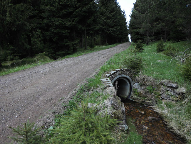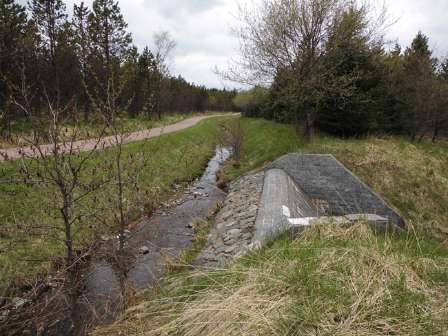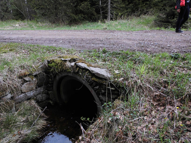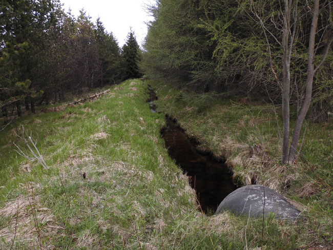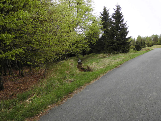 Die Drainagegräben vom Kahleberghang herab (hier von rechts) werden allesamt vom Graben „eingesammelt“. |