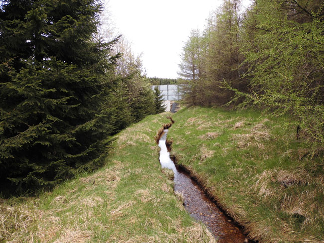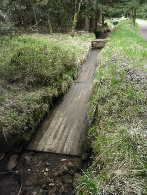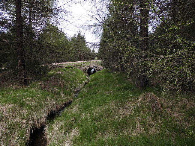 Zunächst geradeaus und ein Stückchen bergab haben wir ihn dann: Hier kommt der Neugraben aus dem Moor. |