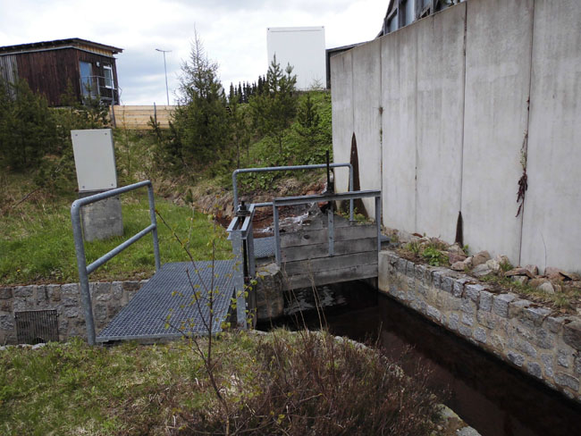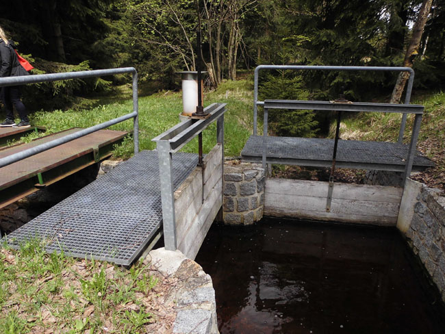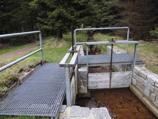 Der Ablauf in Richtung der Roten Weißeritz ist mit einem nagelneuen Thomson-Wehr ausgestattet, damit man ablesen kann, wieviel Wasser hier abgegeben wird. |