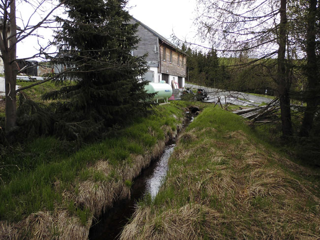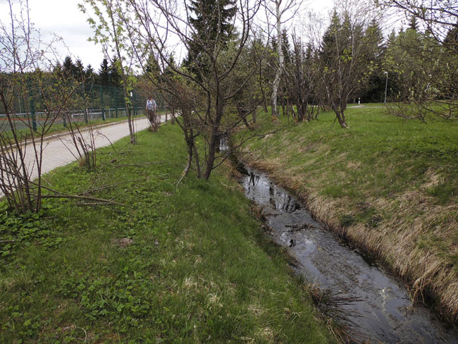 Dann verschwindet der Neugraben zugunsten des Schießstandes und der Loipen kurz unter der Erde. Direkt durch dem Schießstand fließt ein Zulauf des Warmgrabens (im Bild von rechts) in den Graben. Deshalb auch der Ablass, damit der Bachlauf Wasser hat. |