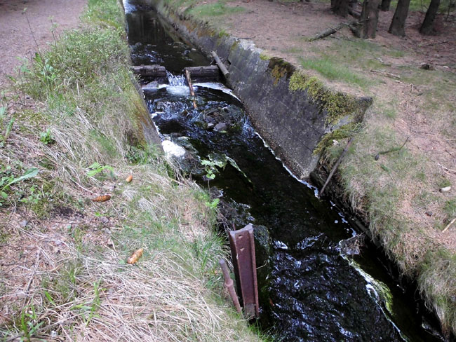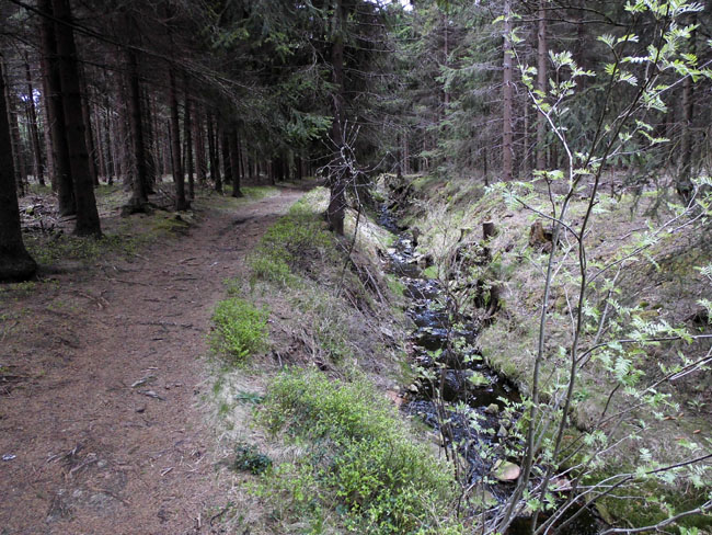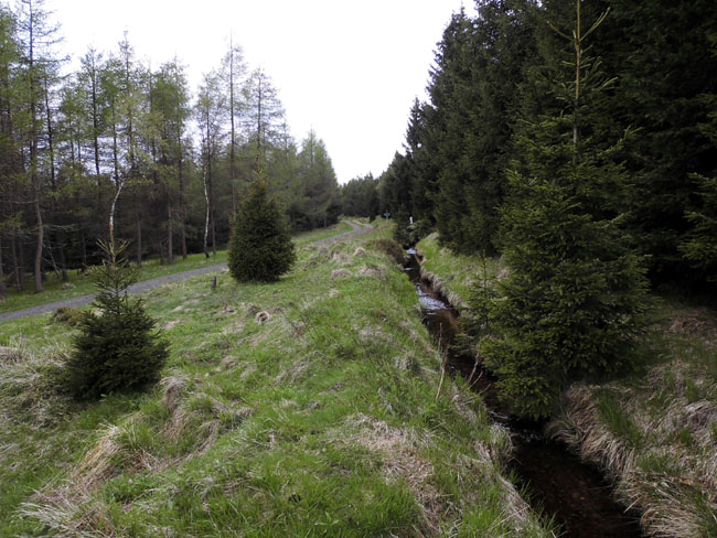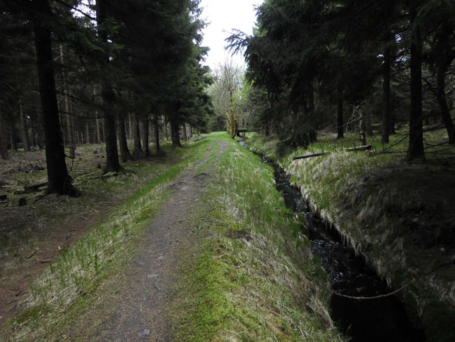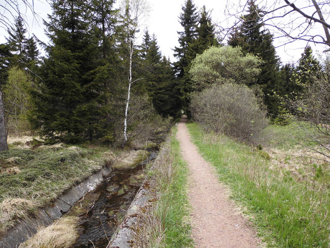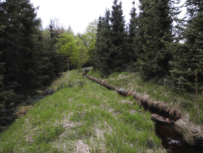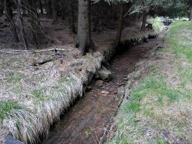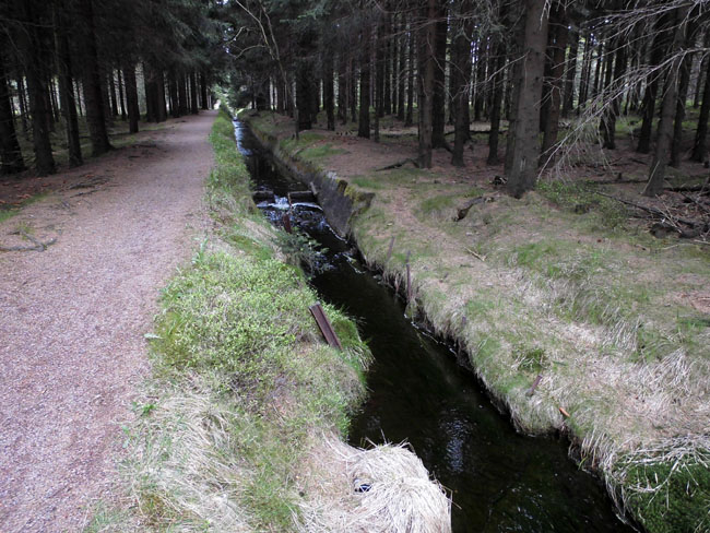 Der Weg scheint in diesem Abschnitt ziemlich begangen zu sein. Sonst fehlt aber ein Fahrweg, wie er sonst oft die Kunstgräben begleitet und zur Instandhaltung eigentlich nötig ist, hier völlig. |