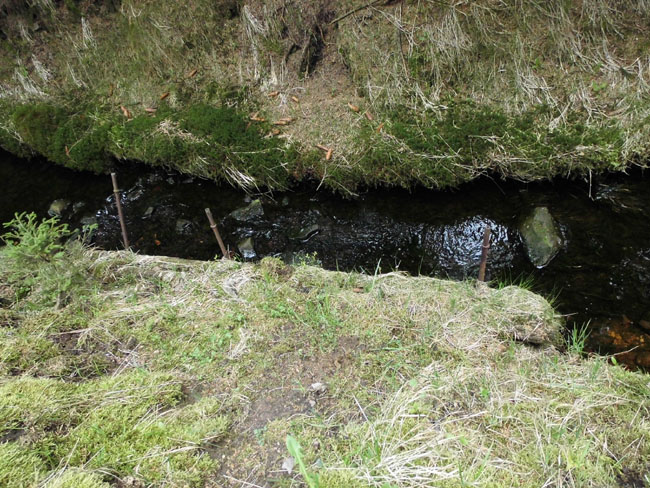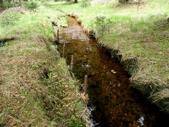An dieser Stelle verraten ein paar in das Ufer gerammte Bohrstangen wieder den bergbaulichen Ursprung der Grabenanlage. |