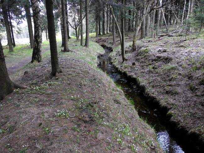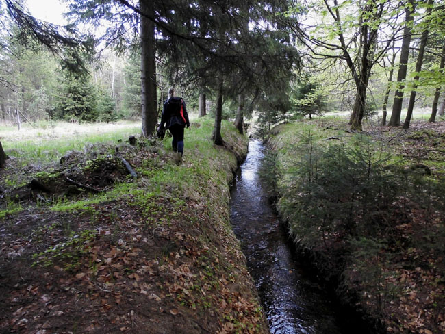 Ein Stückchen Hochwald macht die Wanderung bequemer. Auch hier ist der Graben kaum einen Meter breit und tief. Der Erdwall am linken Ufer erscheint oft viel höher… |