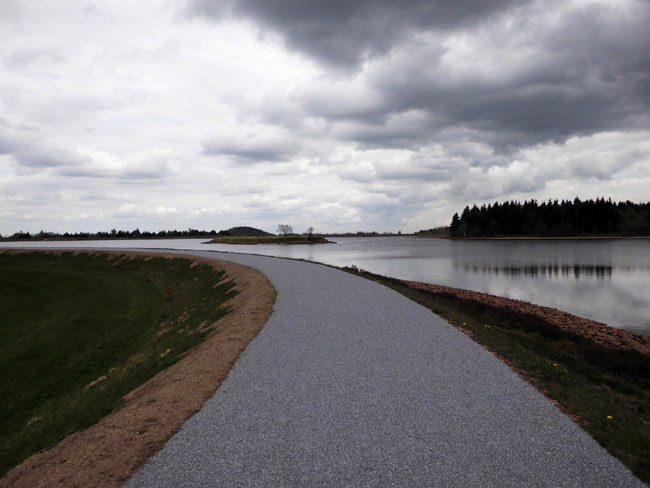 Wir genießen trotz des inzwischen etwas zugezogenen Himmels erstmal den Rundweg auf der Dammkrone um den Galgenteich. |