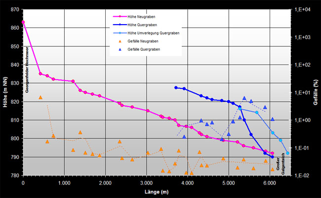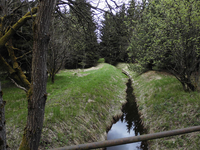 Wüßte man´s nicht besser, sähe der Graben hier wie ein natürliches Bachbett aus. Um das Gefälle hinzukriegen, wurde er wieder mehrere Meter in das Gelände eingetieft. |