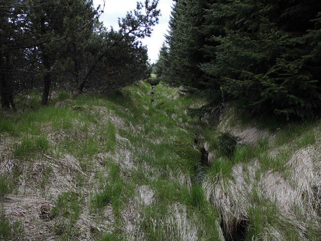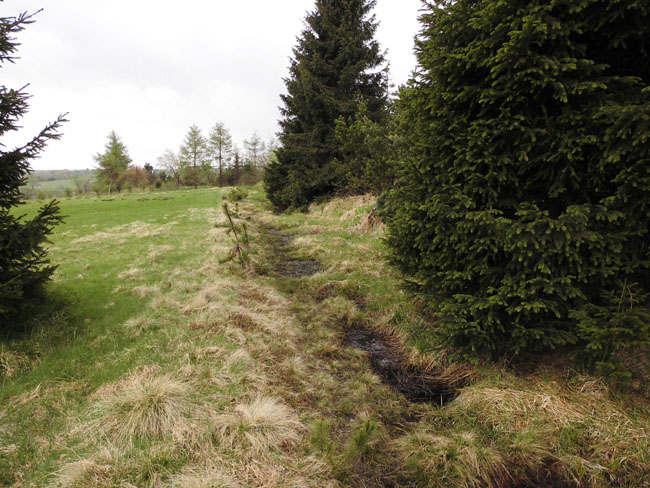 Der Graben ist nicht breit und talwärts durch einen Erdwall gekennzeichnet. |