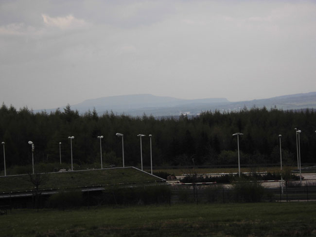 Das lichtere Gelände macht dafür jetzt ein paar Ausblicke möglich: Hinter den Anlagen des Grenzübergangs der „rangezoomte“ Große Winterberg. |