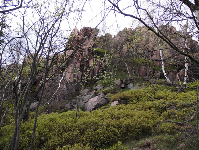 Der Porphyr ist steil geklüftet und tiefrot – ein schicker Kontrast zu den Beerensträuchern, die das Umfeld der Klippen überwuchern. Wir sind aber noch zu früh im Jahr zum Naschen da. |