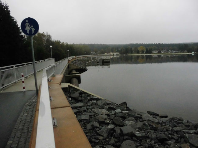Wir starteten von den Greifensteinen aus und stehen jetzt auf dem Damm am Stauweiher: Gleich am Ostrand des Steinschüttdammes das Überfallwehr. Etwas weiter hinten der Einlaufturm des Grundablasses. |