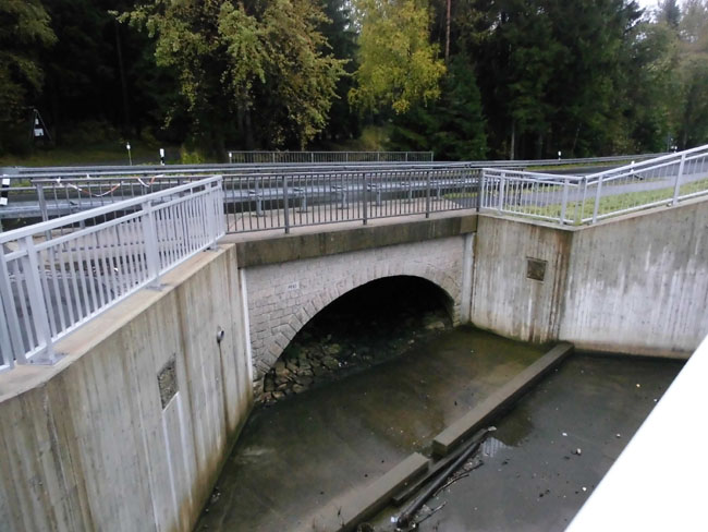 Unter der Straße nach Geyer hindurch kann bei Hochwasser der Greifenbach ins Tal fließen. |