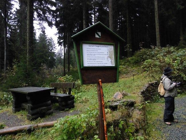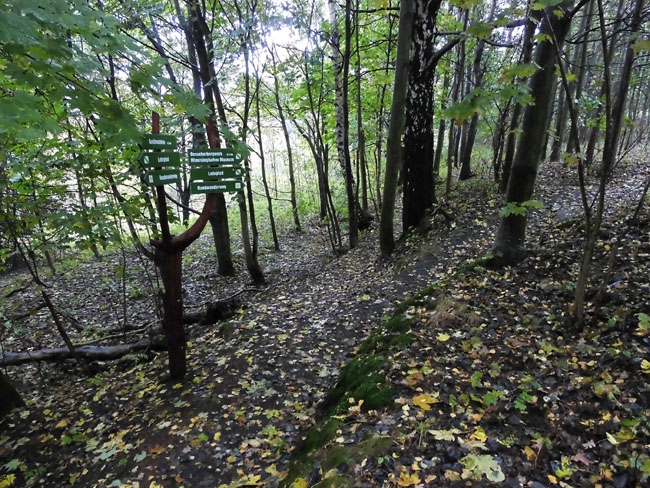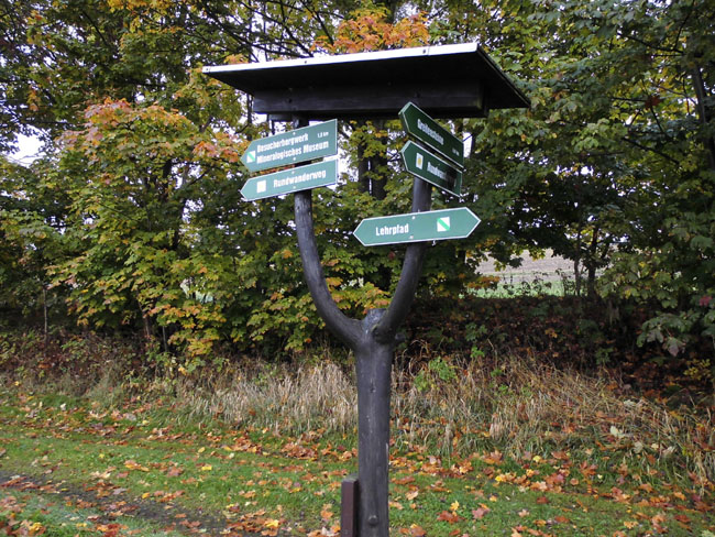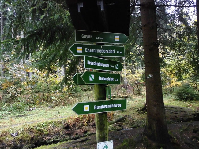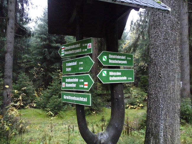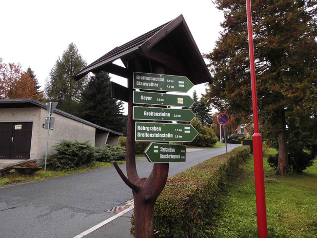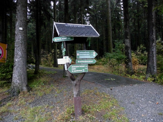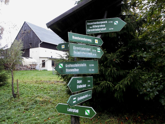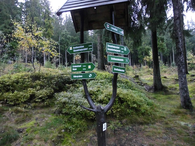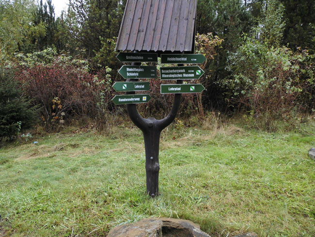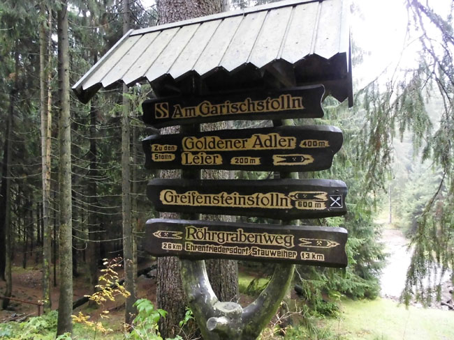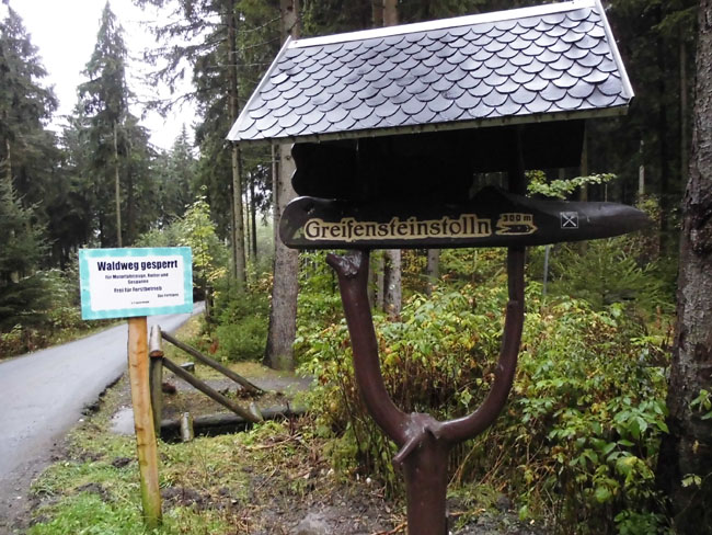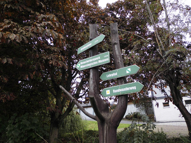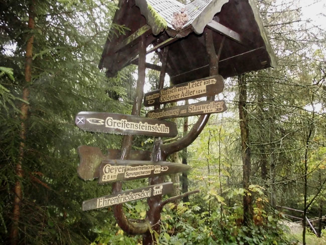 Geradeaus kommt die neue Sauberg-Auffahrt und wieder ein Wegweiser zum Besucherbergwerk. Die einstige Grabentrasse ist dagegen völlig verwachsen und nicht mehr begehbar. |