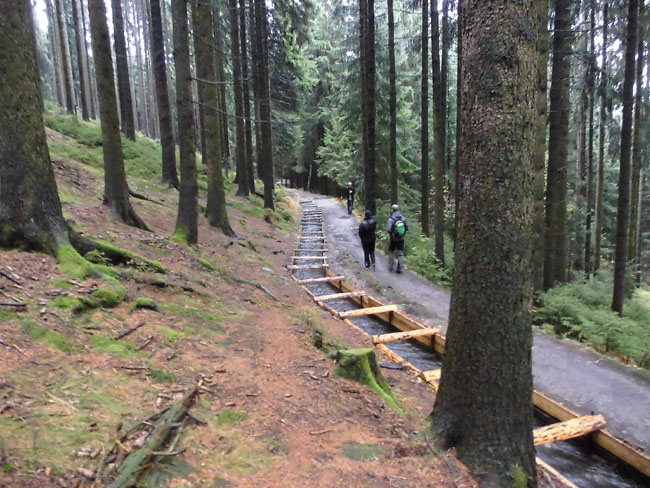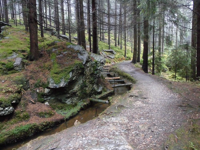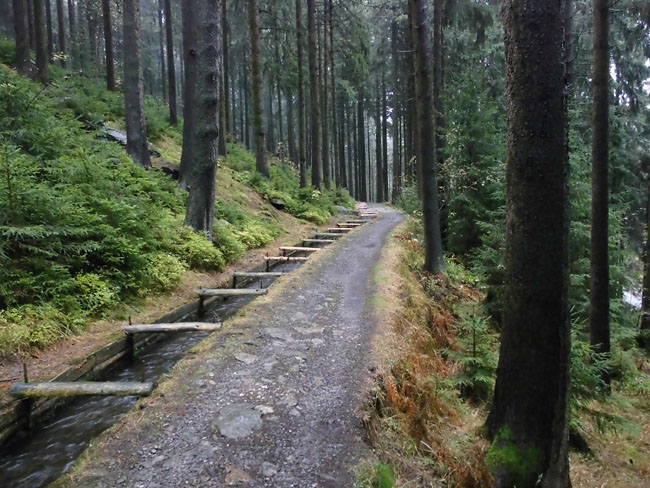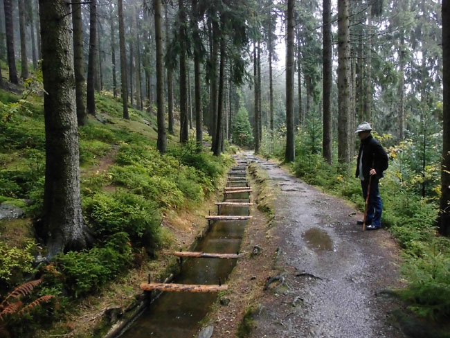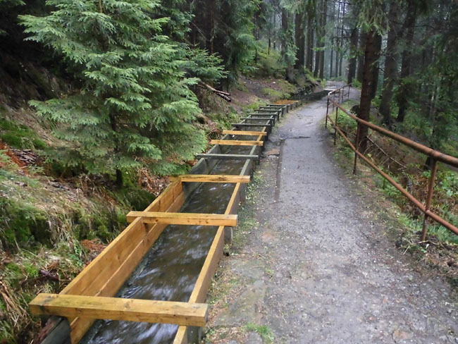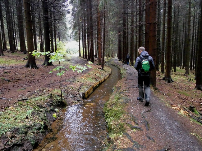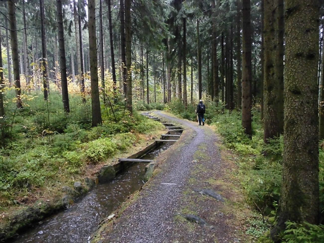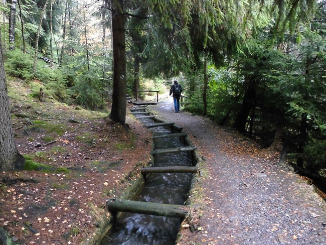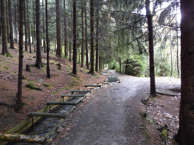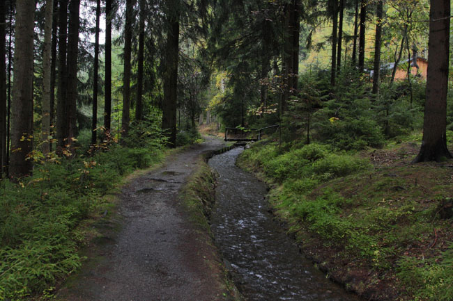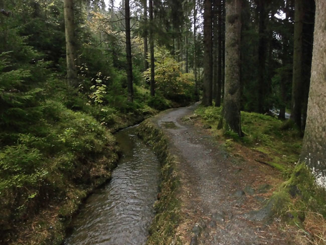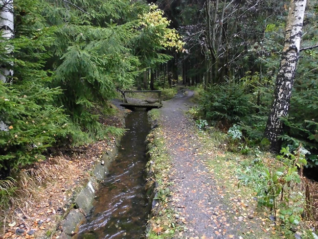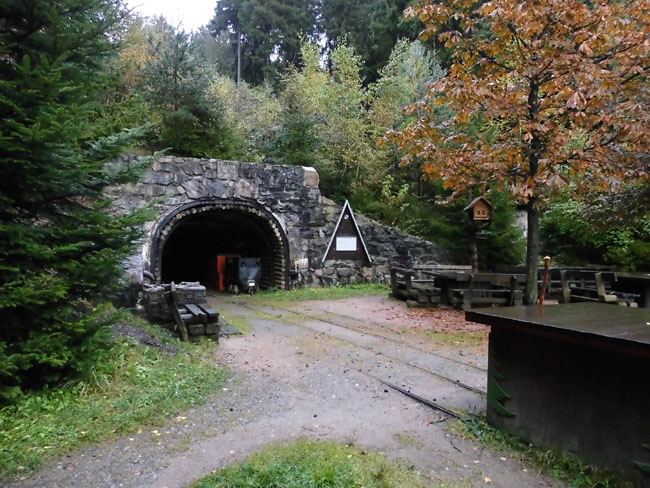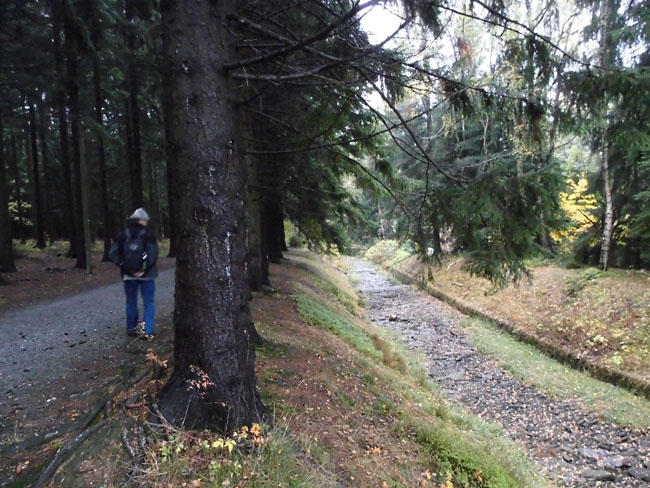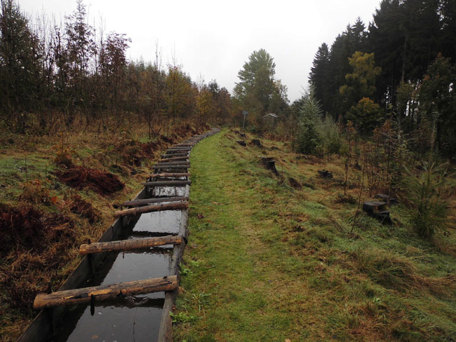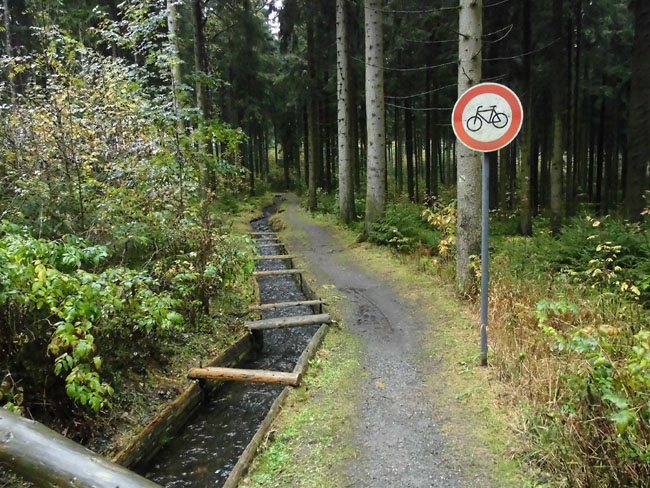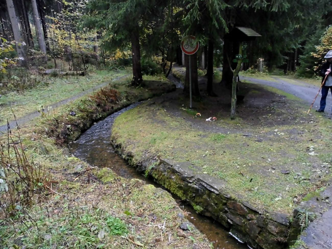 Die Wanderer werden hier bergauf geschickt, wo das Besucherbergwerk ist. "Unser Rohr" führt zwischen den Bäumen im rechten Drittel noch geradeaus. |