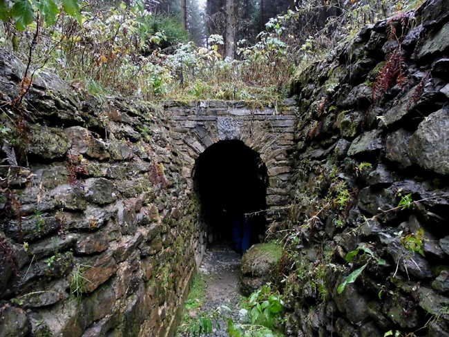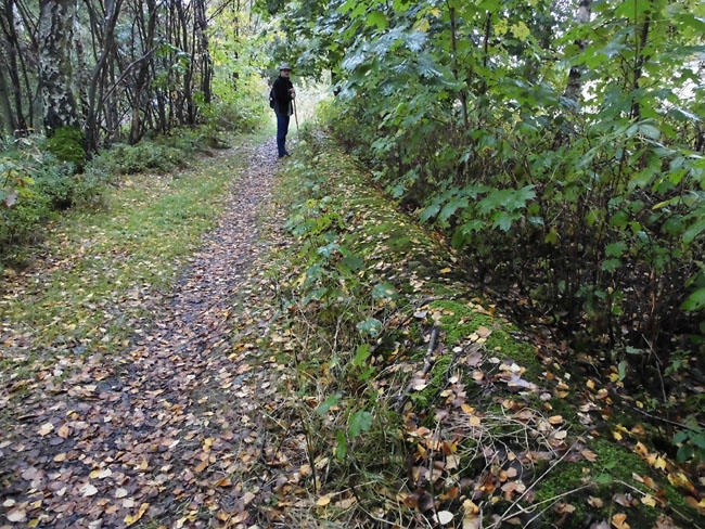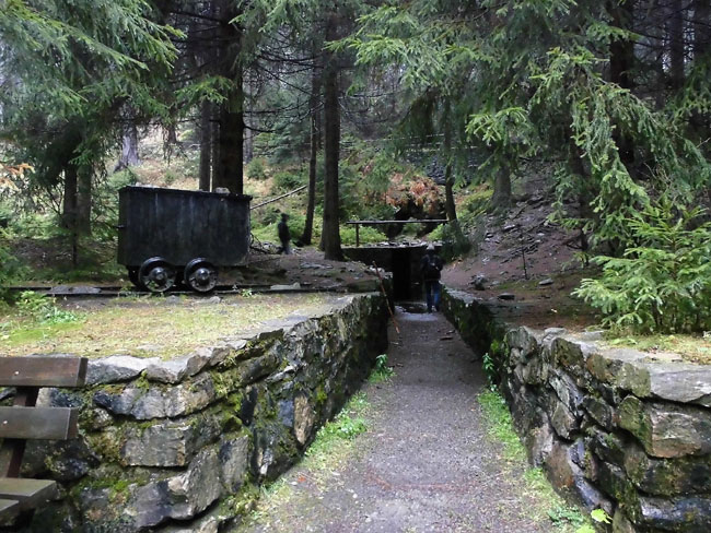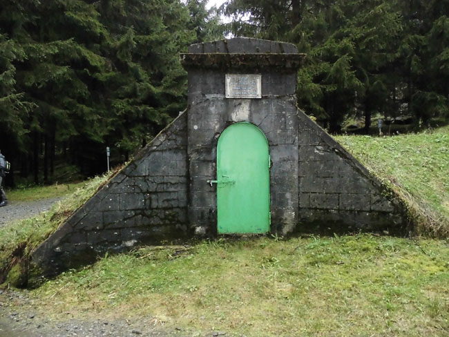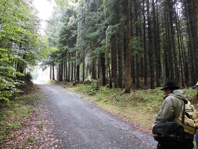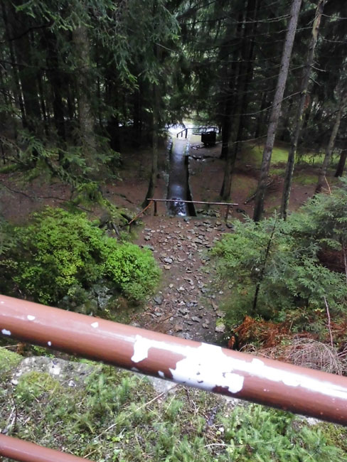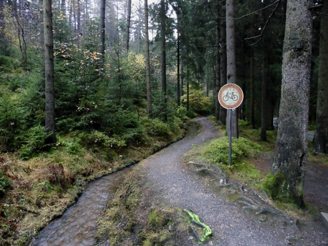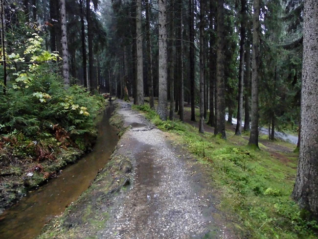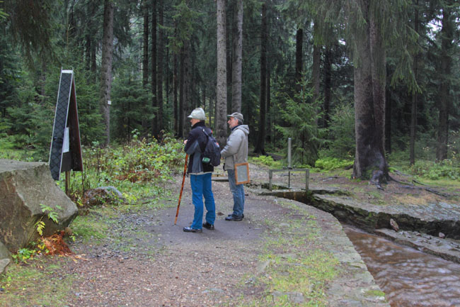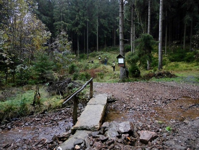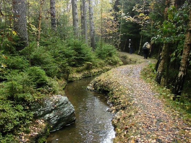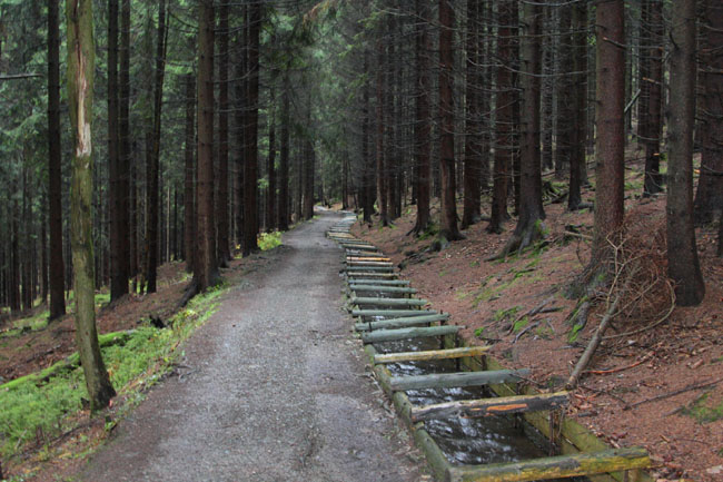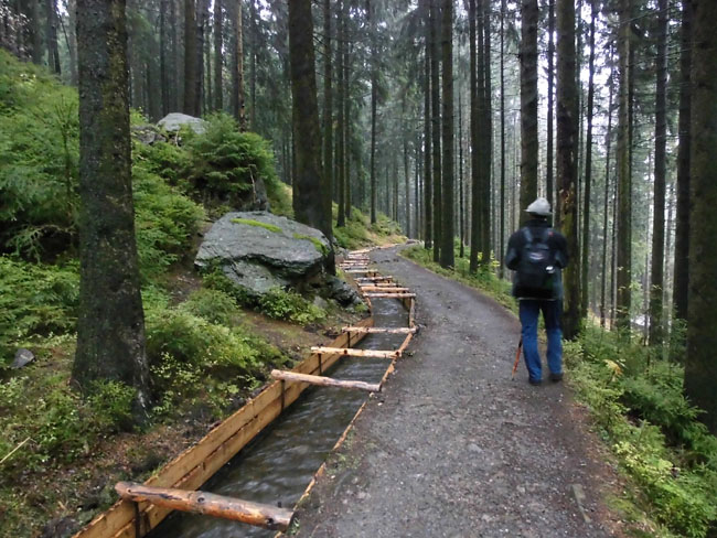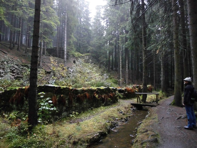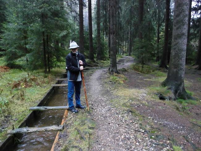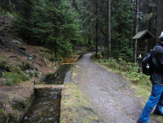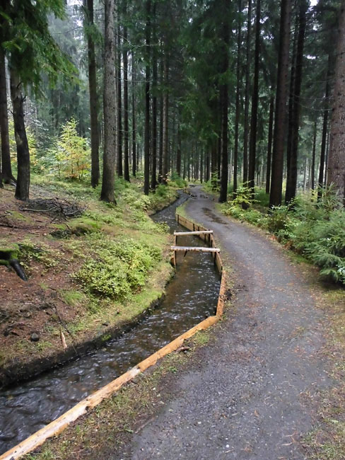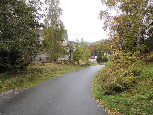 Die Wanderer werden hier bergauf geschickt, wo das Besucherbergwerk ist. "Unser Rohr" führt zwischen den Bäumen im rechten Drittel noch geradeaus. |
