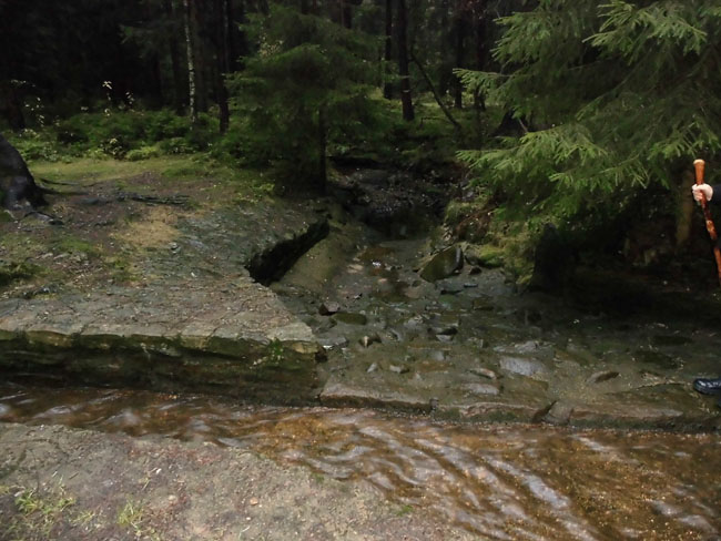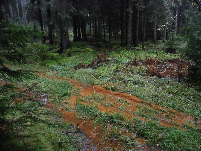 In Anbetracht des regnerischen Wetters stand allerdings jede Fahrspur voll davon, so daß wir nicht so richtig dahinter kommen konnten, woher dieses Wasser stammt... Aber aus Altbergbau kommt es gewiß. |