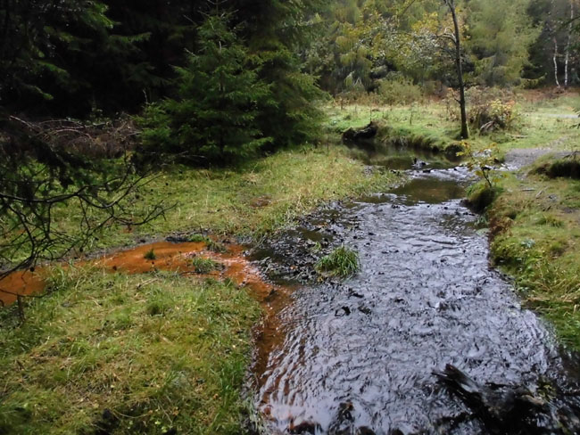 Aus irgendeiner alten Halde sickern hier diese Limonit-braunen Wässer in den Greifenbach. |