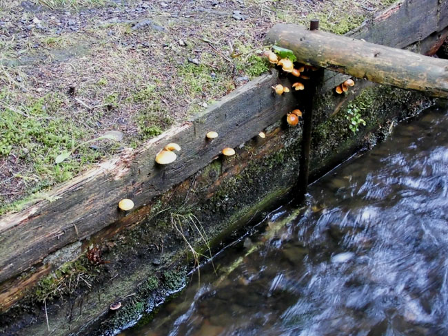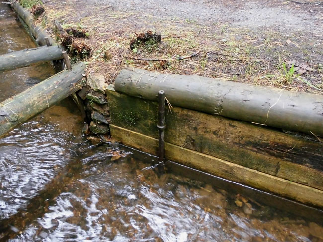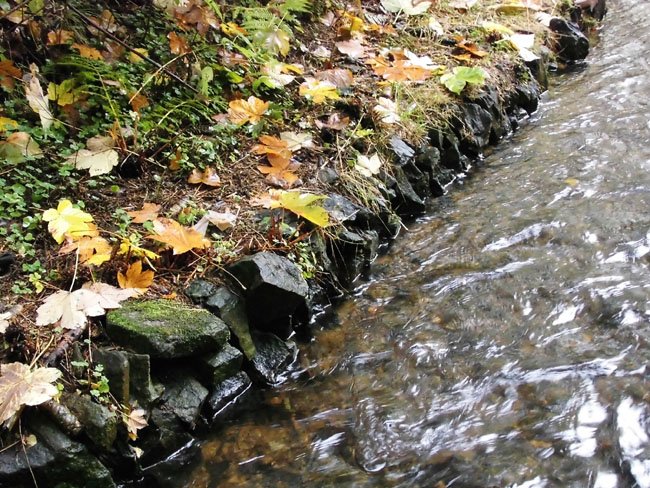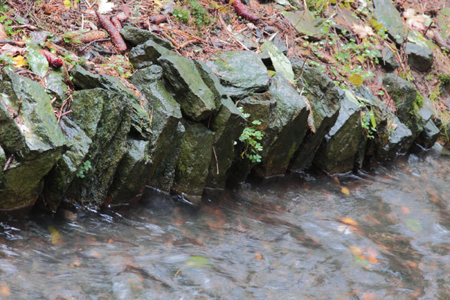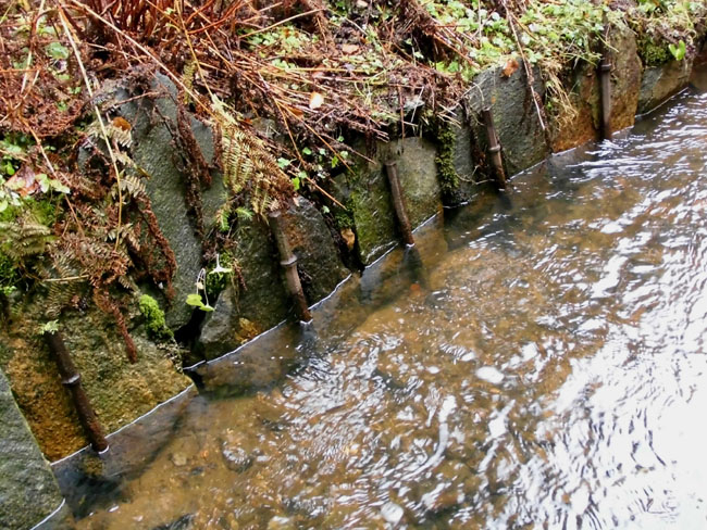 Interessant hier auch die Art der Uferbefestigung: Diese Schieferplatten sind quer zur Fließrichtung eingebaut. Wohl die ältere Bauweise, denn dazu braucht es keine Bohrstangen... |