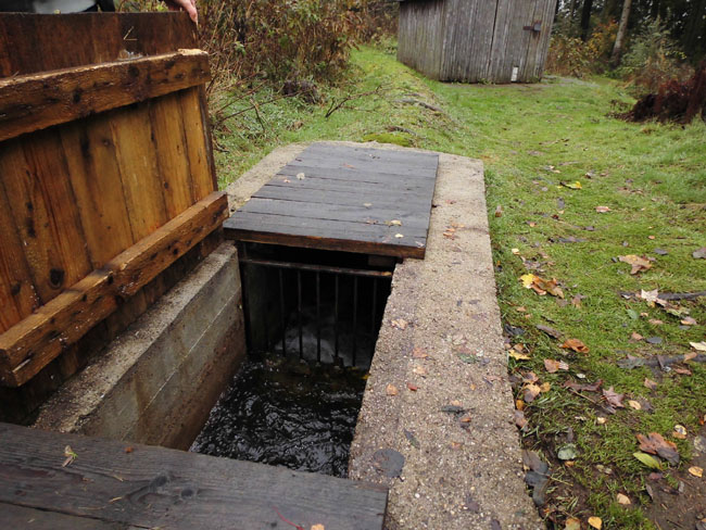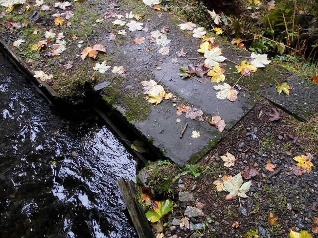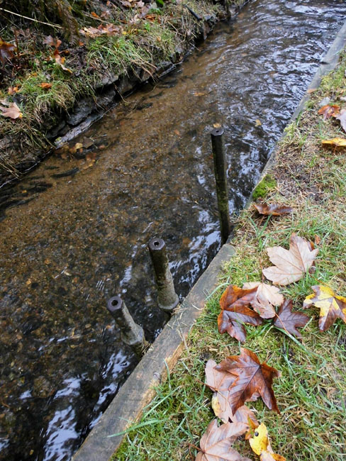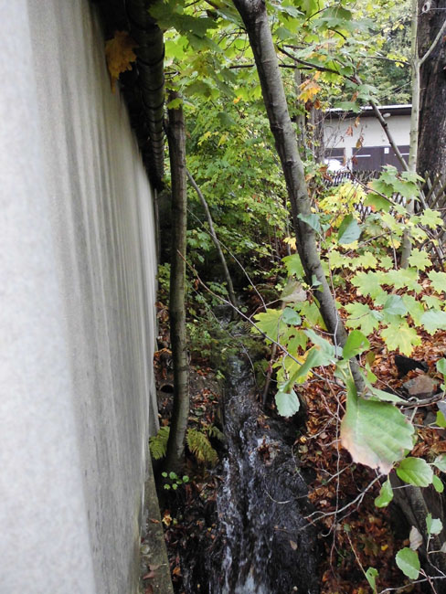 Direkt an der Gebäuderückwand kommt das Röhrgrabenwasser heute wieder im offenen Graben herunter. |