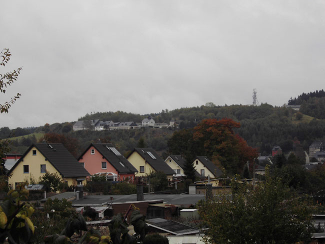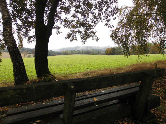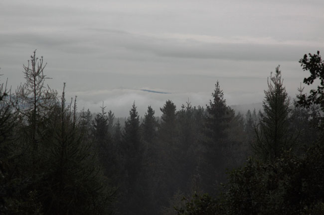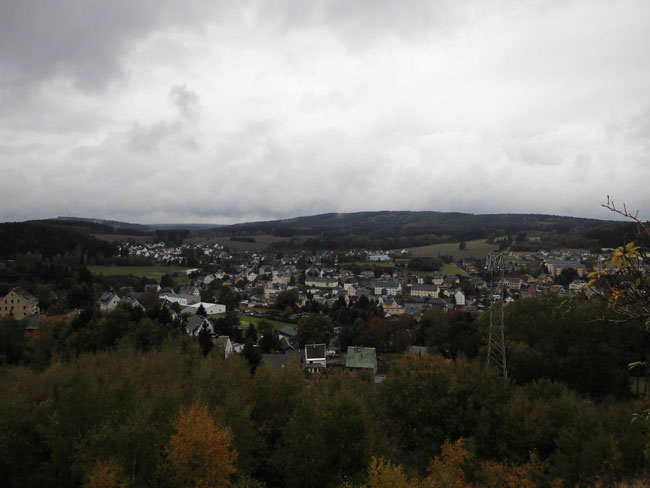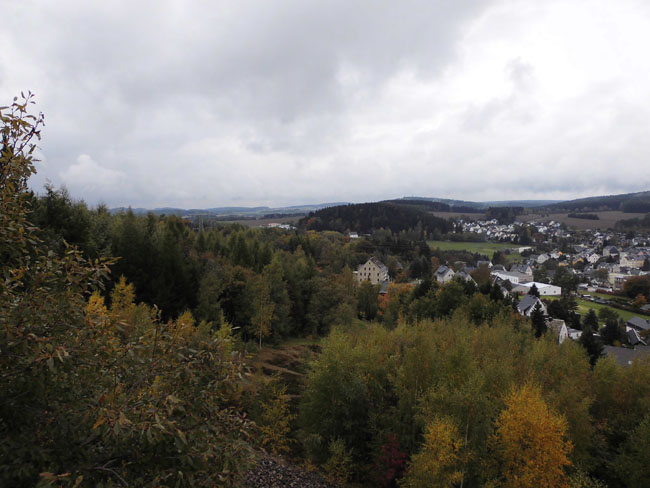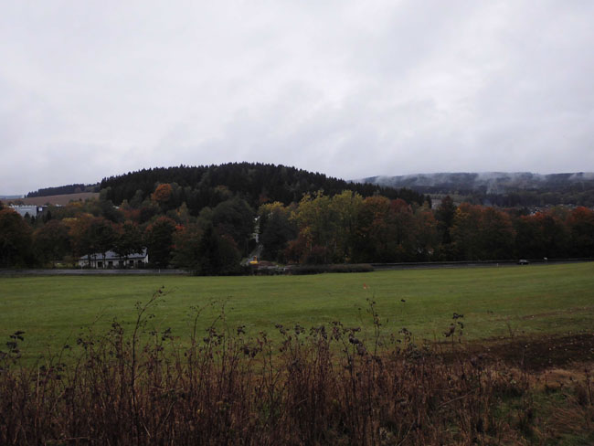 Unterhalb von unserem Weg führt quer durch´s Foto die B95 nach E´dorf. Dahinter die bewaldete Friedrich-August-Höhe. Die Greifensteine rechts liegen immer noch im Nebel. |
