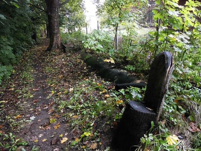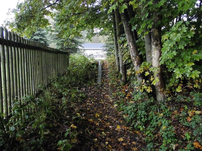 Oberhalb vom Baumarkt gehen Wanderweg und Rohrtour wieder auseinander (Das Rohr liegt oben auf der Geländestufe unter der Baumreihe - sieht man halt nur auf dem Foto schlecht). |