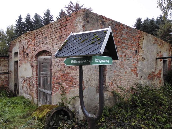 ...und ist nur noch an diesem langen "Buckel" zu erkennen. Wie uns eine schon etwas verwitterte Tafel an der letzten Schneise verraten hat, wurde der Graben 1938 nach einem Dammbruch zwischen der Pumpenstation und der B 95 verrohrt, um Verschmutzungen, winterlicher Vereisung, Verstopfern und in der Folge erneuten Dammbrüchen vorzubeugen. In den 1950er Jahren wurde auch der zweite Abschitt bis zum Oelmann-Gut verrohrt. Der "eingehauste" Abschnitt hat heute eine Gesamtlänge von zirka 2,2 km. Wieso eigentlich heißt er schon immer "Röhrgraben", wenn er doch erst in der letzten Betriebsphase in die "Röhre" gekommen ist? |