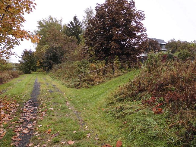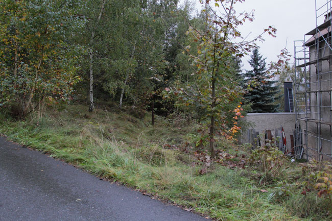 Hier hinter dem Haus auf dieser Geländestufe könnte der Röhrgraben ursprünglich einmal angekommen sein. (Foto: J. Weidner) |