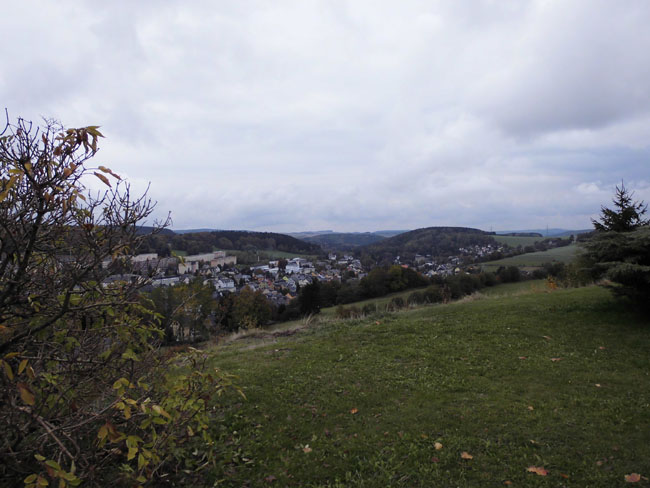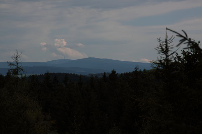 Also drehen wir um und genießen noch vom Gästeparkplatz aus die - etwas aufgezogene - Aussicht: Hier nach Südwesten mit der markanten Friedrich-August-Höhe am Nordende des Hahnenrücks, links davon der Ortsteil Mönchbad... |
