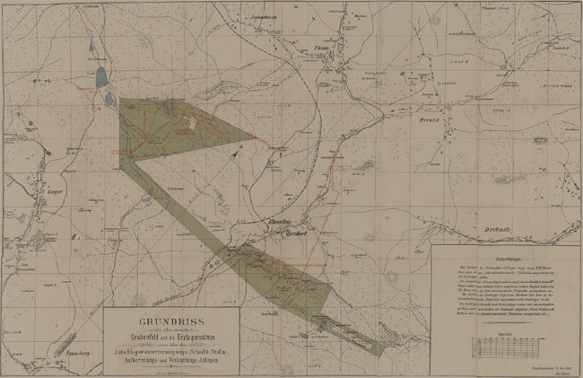 Auf diesem Ausschnitt aus der oben schon gezeigten Grubenfeldkarte liest man neben dem Leier Stolln "Angefangenes Poch- und Waschwerk". Die Karte stammt aus dem Jahre 1881, da war es noch immer nicht vollendet...