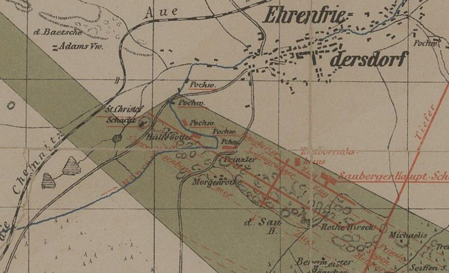 So richtig funktioniert hat aber die Wiederinbetriebnahme auch diesmal nicht, denn wir lesen schon im Rückblick auf 1881 wieder: „Nachdem dieses Berggebäude in das Eigenthum einer Actiengesellschaft übergegangen war, ist der Betrieb Mitte März 1881 wieder eröffnet…“ Und 1884: „Das gegen Schluß des Jahres 1882 gänzlich zum Erliegen gekommene, damals in den Händen einer Actiengesellschaft befindlich gewesene Berggebäude Ehrenfriedersdorfer vereinigt Feld war im darauffolgenden Jahre im Wege nothwendiger Versteigerung in den Besitz von Männern gelangt, welche es sich zur Aufgabe stellten, dasselbe durch eine neu zu bildende Gewerkschaft mit möglichster Energie, zunächst allerdings unter Vermeidung größerer und kostspieliger Bauten, wieder in Betrieb zu nehmen…“ Und im Jahr 1891: „Der Geyer-Ehrenfriedersdorfer Zinn- und der Annaberger Silberbergbau scheinen nach den Ergebnissen des Berichtsjahres zunächst ganz zum Erliegen kommen zu wollen.“ Erst im Jahr 1904 kommt es überhaupt wieder zur Erzförderung (Auszug aus dem zweiten Teile des bergamtlichen Jahresberichts, C. Erzbergbau, I. Neue Aufschlüsse, sowie geognostisch oder bergmännisch bemerkenswerte Vorkommnisse): „Nach langem Stilliegen wurde bei Ehrenfriedersdorfer vereinigt Feld Fundgrube im Oktober vergangenen Jahres der Betrieb wieder eröffnet und zunächst über dem Sauberger Stolln auf dem Cypressenbaumer Zuge ein Überhauen in Schlag genommen. Dabei trat der genannte Gangzug in hübscher Erzführung auf, so daß bis Schluß des Jahres bereits gegen 200 Zentner gute Pochgänge und Scheideerze gewonnen und über Tage auf Vorrat gestürzt werden konnten.“ Für die neue Investitionsfreude war vor allem der Siegeszug der Elektrizität in der Industrie ein wesentlicher Grund, denn in der Ausgabe 1906 lesen wir zur wirtschaftlichen Lage des Bergbaues: „Wichtiger für den sächsischen Erzbergbau ist der Zinnpreis, der auch im Jahre 1906 seine — den um Altenberg und Zinnwald gelegenen Zinngruben sehr zu statten kommende — Aufwärtsbewegung fortgesetzt hat. Im ersten Vierteljahr stand der Preis für 100 kg Zinn ziemlich beständig bei 340,00 M; infolge großer amerikanischer Käufe stieg darnach der Preis fortgesetzt und erreichte am 16. Mai die bisher noch nicht gekannte Höhe von 436,00 M. … Bedenkt man, daß der mittlere Preis für 100 kg Zinn im Jahre 1896 nur 125,00 M betrug und seit jener Zeit mit geringen Schwankungen beständig bis zu 361,84 M im Jahre 1906 angestiegen ist, so wird es erklärlich, daß das Kapital große Anstrengungen macht, diese vorzügliche Marktkonjunktur durch Wiederaufschluß der seit langen Jahren verlassenen Zinnsteinlager um Geyer und Ehrenfriedersdorf auszunützen.“ Tatsächlich fand sich wieder ein neuer Käufer, denn „Das Berggebäude Ehrenfriedersdorfer vereinigt Feld Fundgrube in Ehrenfriedersdorf gelangte im Jahre 1906 in den Besitz der Gewerkschaft „Albertshütte“ in Leipzig, die den Betrieb wieder aufnahm und am Sauberge den Prinzler Tageschacht (zur Herstellung eines zweiten Tageausganges oder Fluchtweges) und im Freiwalde den Gahrisch Stolln äufzugewältigen begann.“ Auch der hatte aber wohl nicht genügend Kapital flüssig, denn schon 1913 war wieder Schluß: „Beim Marienberger Bergreviere hat die Produktion fast ganz aufgehört, da der Zinnbergbau von Geyer und Ehrenfriedersdorf hier einstweilen wieder zum Stillstand gekommen ist.“ Während des 1. Weltkrieges wurde dann die Kriegsmetall- Aktiengesellschaft in Berlin Bergwerkseigentümer, hielt die Grube jedoch eigentlich überwiegend in Fristen. Zum Kriegsende steht dann (in der Ausgabe von 1919) zu lesen, daß „der starke Rückgang des Ausbringens im Marienberger Reviere darauf zurückzuführen ist, daß die wichtigste Wolfram- und Zinnerz produzierende Grube dieses Reviers, Ehrenfriedersdorf Vereinigt Feld, infolge Aufhörens des Wolframbedarfes für die Kriegsindustrie und Ausscheidens der seitherigen Pächter in dieser Grube, der Kriegsmetall- Aktiengesellschaft, ihren Betrieb eingestellt hat.“ Der nächste Versuch wurde nach 1933 und etwas wissenschaftlicher gestartet. Im „Bericht der Staatlichen Lagerstätten-Forschungsstelle, Leipzig, für das Jahr 1934/35“ können wir lesen, daß „die in den Jahren 1933 und 1934 auf Grund der montangeologischen Vorarbeiten der L. F.*) begonnenen Untersuchungsarbeiten im erzgebirgischen Erzbergbau … mit den bewilligten Reichs- und Landesmitteln fortgeführt wurden…“ und: „Die Untersuchungen erstreckten sich auf Vorkommen im Osterzgebirge, im Marienberger Revier, im Schneeberger Revier und im Vogtland und werden in nächster Zeit auf das Ehrenfriedersdorfer Ganggebiet ausgedehnt werden.“ *) Das Kürzel ,L. F.' bezeichnete die Lagerstättenforschungsstelle beim Oberbergamt. Zwei Jahre später lesen wir im „Tätigkeitsbericht der Staatlichen Bergwirtschaftsstelle auf das Geschäftsjahr 1936“: „In der Berichtszeit wurden folgende Untersuchungsbetriebe neu eingerichtet: