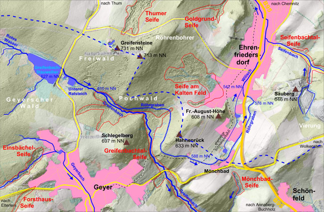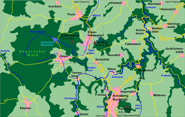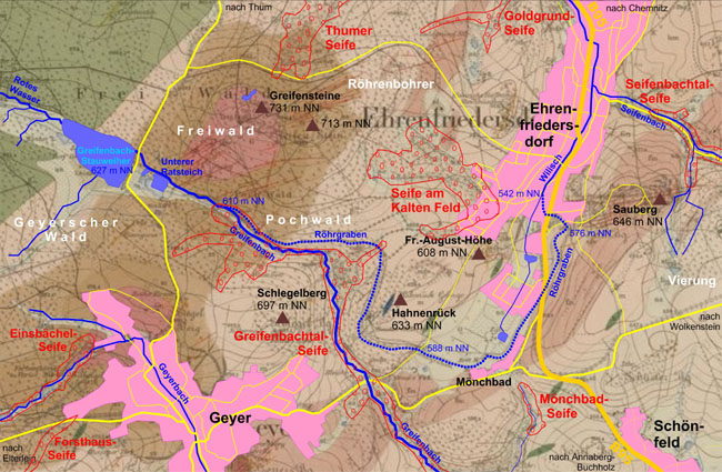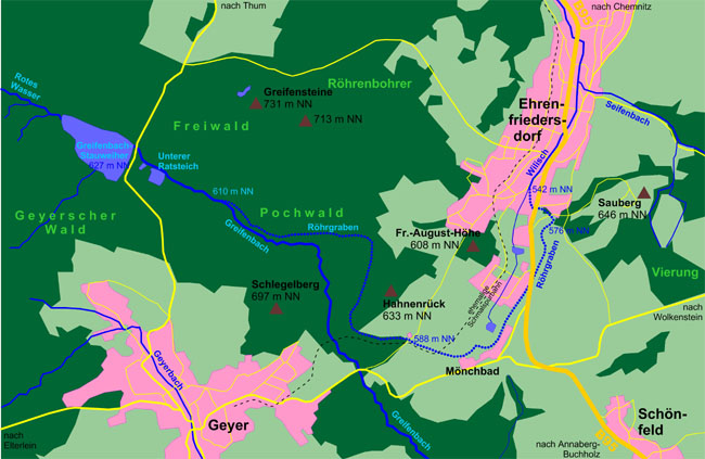 Historischer Überblick Für unsere Rubrik „Wasserwege“ haben wir uns 2015 noch für den „Röhrgraben“ bei Ehrenfriedersdorf interessiert. Wie gewohnt, stellen wir einen kurzen Überblick zur Geschichte des Bergbaus – der das Wasser benötigte – voran. Die heutige Stadt Ehrenfriedersdorf liegt im Wilischtal, einem Seitental der Zschopau, und gehört geographisch zur Landschaftseinheit „Mittleres Erzgebirge". Morphologisch ist die Region durch mäßig geneigte Hänge an der Nordabdachung des Erzgebirges gekennzeichnet. Markante Erhebungen sind die Granitklippen der Greifensteine (731 m) im Westen und der Sauberg (646 m) östlich der Stadt. Das Gebiet gehörte in der Besiedlungsphase nicht zur Mark Meißen, sondern zum Pleißenland und war damit reichsunmittelbares Territorium. In dieser Zeit befand es sich unter Lehnsherrschaft der Waldenburger. 1339 wurde die Siedlung als Erinfritstorf erstmals urkundlich erwähnt. Mitte des 15. Jahrhunderts hatte der Ort volle Stadtrechte erhalten und galt als einer der reichsten im Erzgebirge.