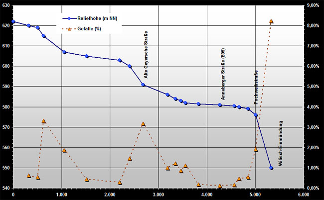 Schon seit dem 19. Jahrhundert wurde das Grabenwasser auch durch die in Ehrenfriedersdorf ansässige Industrie genutzt (vgl. (3), (4), (5), (8), (9)) sowie als „Löschwasserentnahmestelle“ für die Stadt Ehrenfriedersdorf. Namentlich bekannt werden aus den Akten unter anderem Christian Friedrich Bauer, Handelsmann in Ehrenfriedersdorf, zum Bau einer Spinnfabrik 1847, Steiger Wetzig zum Betrieb einer eingebauten Baumwollspinnerei in dem ihm gehörenden Roten Pochwerk am Sauberg, 1849, Carl Traugott Stopp und Julius Friedrich Ulbricht, 1860-1862, ebenfalls Spinnereibesitzer in Ehrenfriedersdorf. Ab 1908 erfolgten Verhandlungen mit der Stadt Ehrenfriedersdorf über die Nutzung des Röhrgrabenwassers, welche schließlich 1919 zum Kauf durch die Stadtgemeinde führten (vgl. (14), (15)). 1939 wurde der Graben zwischenzeitlich wieder an die Sachsenerz GmbH verpachtet (13). Noch bis zur Stilllegung des Bergbaus 1990 wurde das Wasser des Röhrgrabens als Brauchwasser für die Zinnaufbereitung verwendet. Er galt damit als der älteste noch in Betrieb befindliche Kunstgraben Gesamt-Deutschlands. Der Höhenunterschied zwischen Anfangs- und Endpunkt des Röhrgrabens beträgt laut Wikipedia 23,5 m; dies entspricht einem Gefälle von 0,43 %. Wir kommen anhand der Topographischen Karten auf zirka 34 m Höhenunterschied (bis zur oberen Wäsche), was bei 5 km Länge dann etwa 0,7 % ergibt. Anhand der zugegebenermaßen nicht immer sehr genauen Höhenangaben von Google Earth kommen wir auf folgende Übersicht und bei ziemlich genau 5 km Länge bis Pochwerkstraße auf ein mittleres Gefälle von 1,07 % bis zur Pochwerkstraße in Ehrenfriedersdorf. |