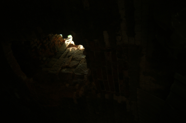 In der Gewölbedecke entdecken wir noch einige der Schürlöcher, über die der Brennstoff – grob gemahlene Braunkohle – eingefüllt wurde. |