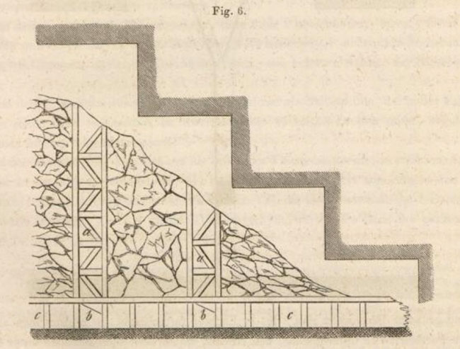 Doch das „gebräche Gebirge“ bei Hainichen erforderte bei dieser Abbaumethode die Verwahrung des Hangenden. Dazu wurden, wandrutenartig Schwarten angelegt und mittels etwa 4 Zoll (zirka 10 cm) starker Stangenstücke abgespreizt. Auf 6 Ellen (zirka 3,40 m) rechnete man vor einem auch 6 Ellen hohen Stoße in der Regel fünf Schwarten, welche meistens nicht wieder gewonnen werden konnten, also im Berg verbleiben. Die Spreizen wurden zum Teil beim Nachziehen des Versatzes wieder gewonnen. 5. Die gebrochene Kohle fiel auf die zur schiefen Ebene geformten Versatzmasse und rutschte hier, der Schwerkraft gehorchend, von selbst oder auf Brettern oder Rutschen, nach unten zu einem Transportbehältnis oder wurde gezielt in die Rollen verschüttet und so einem Kohlenkasten zugeführt. Von den Förderleuten, manchmal auch von den Hauern selbst, wurde die Kohle in ungarische Hunte, aber auch in andere Transportbehältnisse, wie Schiebekarren, Schleif- oder Tragekörbe, abgefüllt und zum Schachtfüllort gebracht, wo sie in Fördergefäße umgeladen oder direkt an die Haspelseile angeschlagen und nach Übertage verbracht wurden. Wie der Abbau in den nur flach geneigten, oft