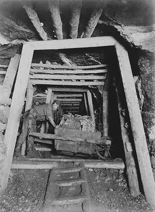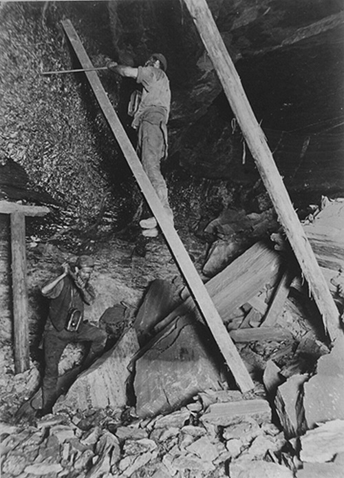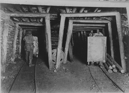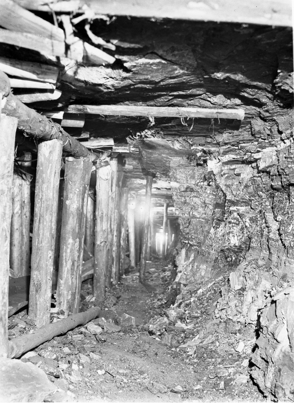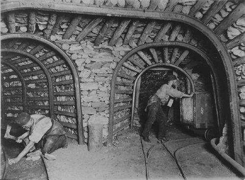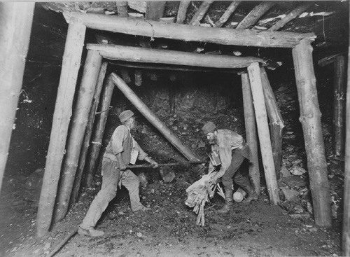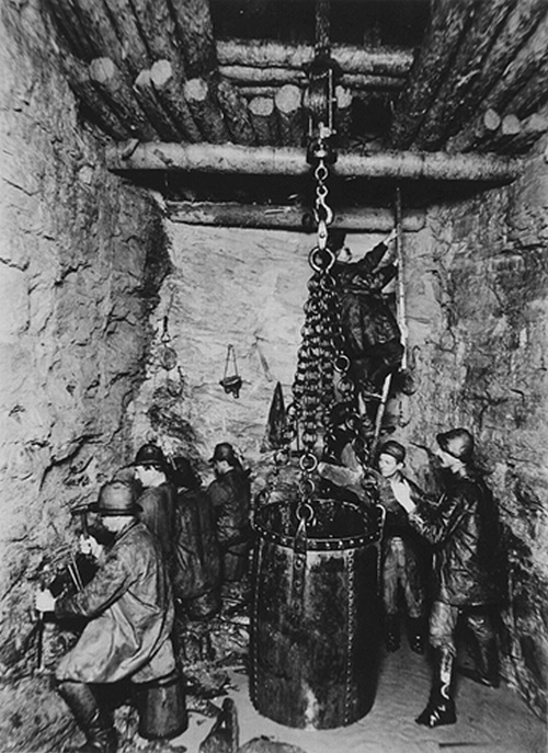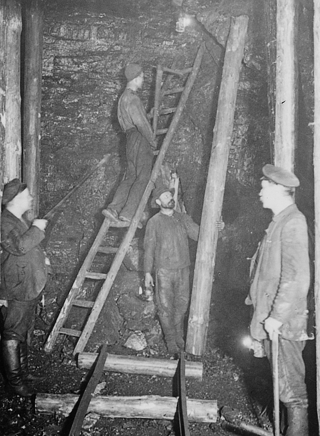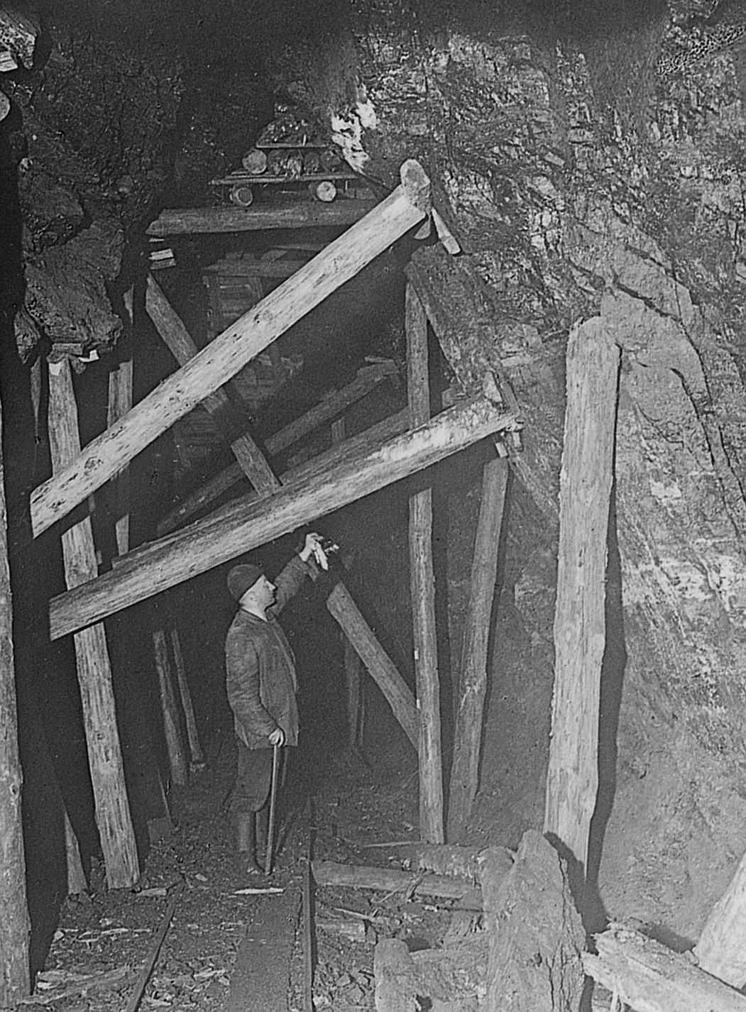![]() Dabei entstanden sehr hohe Abbauhohlräume, was aufwendigen Sicherungsausbau erforderlich machte (Foto: F. Stoedtner aus den Oberschlesischen Borsig-Werken aus dem Jahr 1900).