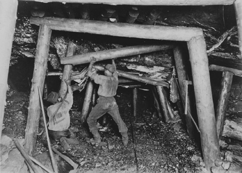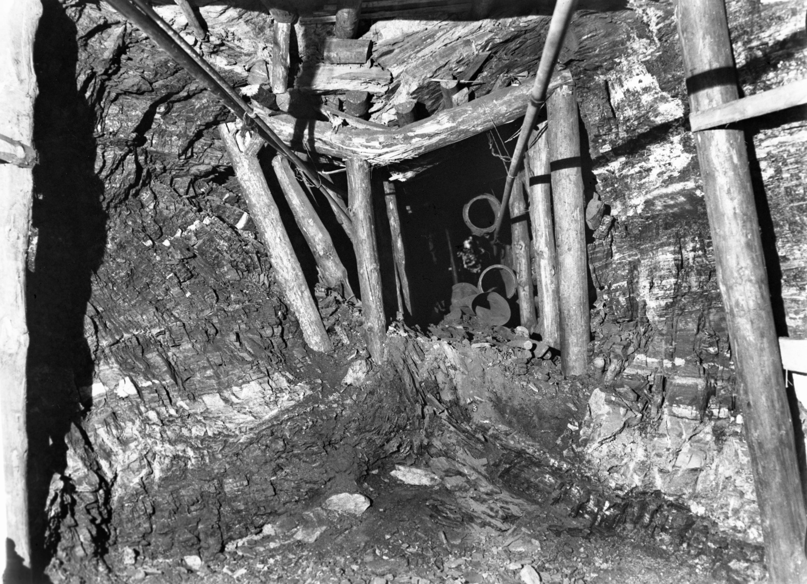 ![]() Auch in diesem leicht fallenden Flöz in Freital- Burgk muß hier gerade der Ausbau erneuert werden. Foto H. Börner, 1893.