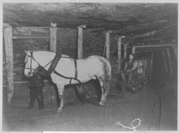 ![]() Nur in größeren Gruben konnten Zugtiere im Transport eingesetzt werden, so wie hier in Freital- Burgk, Foto von H. Börner, 1893.