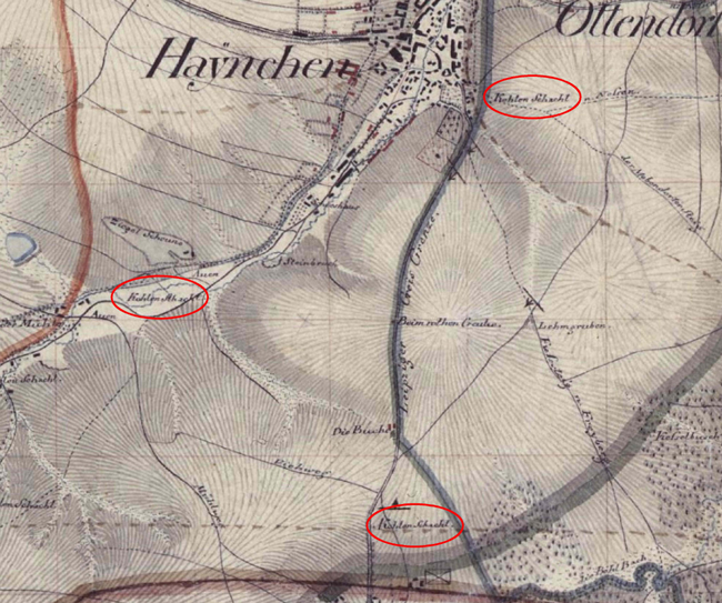 In diesem Ausschnitt aus der Topographischen Karte in der Ausgabe 1843, Blatt 9, Section Freyberg, sind eine "St. Kohlen Gr." neben der Ziegelei südwestlich von "Haynichen" sowie die Steinkohlenschächte bei Cunnersdorf eingezeichnet.
