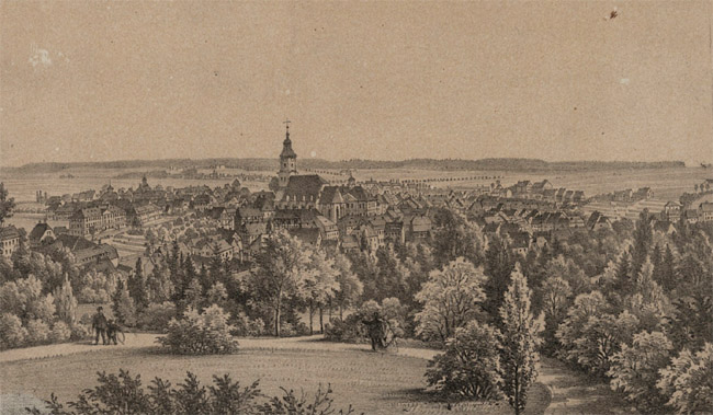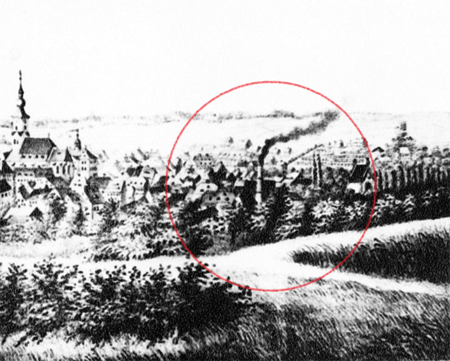 ![]() Vergößerung der in der Mitte dargestellten Stadtansicht. Hier ist der qualmende Schornstein des Steinkohlenwerks zu erkennen.
