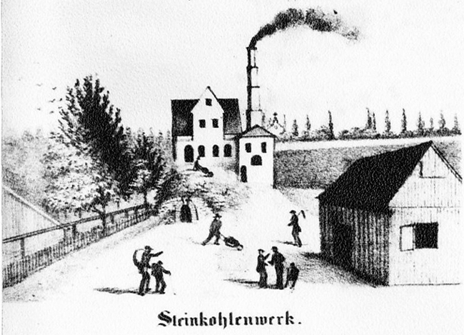 Der Zeichner hielt auch das Steinkohlenwerk selbst für darstellenswert (zweite Zeichnung von oben am linken Rand der Postkarte) und überliefert uns damit einen Eindruck vom Schachtgebäude auf dem Talschacht.