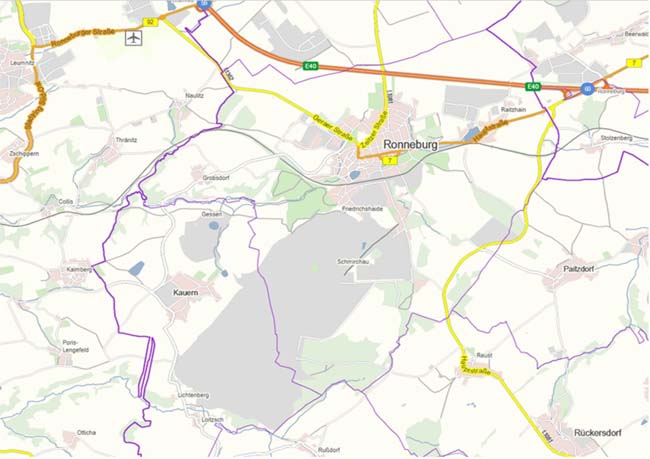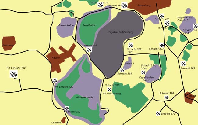 Sandtagebau Lichtenberg An den Westkanten des Erztagebaues Lichtenberg wurde südwestlich des Schachtes 376 seit 1958 in einem bestehenden kleinen Aufschluß Sand als Zuschlagstoff für die Herstellung von Lehmpulpe und später von selbsterhärtendem Versatz gewonnen. Die Vorräte von Bausand waren im I. Quartal 1968 erschöpft. Bis 1970 wurden aus dem Sandtagebau Lichtenberg Kulturbodenvorräte (lehmige Sande) gewonnen, die ausschließlich für die Brandabdeckung auf der Absetzerhalde eingesetzt wurden. Nach 1970 wurde der Aufschluß mit Abraum aus dem Uranerztagebau verkippt. Das verkippte Volumen betrug ca. 5,0 Mio. m³. Tagebau Ronneburg In den Jahren 1952 bis 1956 wurde an der östlichen Stadtgrenze, nördlich der heutigen Bundesstraße 7, aus einem ca. 3 ha großen Tagesaufschluß (Länge ca. 350 m, Breite ca. 75 m und max. Teufe ca. 30 m) Uranerz abgebaut Der Umfang an geförderter Bergemasse betrug ca. 270 Tm³. Bei diesen Arbeiten wurden 4,66 t Uran gewonnen. Der Tagebau und die Halde wurden in den Jahren 1974 bis 1976 wieder urbar gemacht. Der Erztagebau wurde teilweise verfüllt. Der Aufschlußbereich und die baulichen Anlagen wurden bis zum Jahre 1990 als Logistik- und Werkstattstützpunkt unter der Bezeichnung Garage 78 durch den Transportbetrieb der SDAG Wismut genutzt. Die nördliche, wieder urbar gemachte Halde und zwei Drittel des verfüllten Tagebaus werden gegenwärtig als Waldfläche forstwirtschaftlich genutzt. Die südliche Halde zwischen der Bundesstraße B 7 und dem Raitzhainer Bach wurde 1993 abgetragen, die Aufstandsfläche für eine industrielle Nutzung saniert und der Stadt Ronneburg übergeben. Tagebau Stolzenberg Der Tagebau Stolzenberg wurde in den Jahren 1956 bis 1960 südlich der Bundesautobahn A 4 in Höhe der Ortslage Stolzenberg auf einer Fläche von 7,0 ha mit den Abmessungen 350 m x 140 m aufgefahren. Die maximale Teufe lag bei 264 m NN (ca. 30 m unter der Rasensohle). Das Volumen des Tagebaus wird mit 900 Tm3 angegeben. Die Urangewinnung betrug 92,0 t. In den Jahren 1974 bis 1977 wurde der Tagebau mit Haufwerk aus der Teufe der Schächte in Beerwalde verkippt und mit Kulturboden abgedeckt. Die Halde Stolzenberg wurde im Rahmen der Wiederurbarmachung 1977 bis 1979 teilweise profiliert. Die Böschungen wurden auf 1:2,5 abgeflacht. Bis auf die neu angelegten Wege wurde die gesamte Halde mit Kulturboden (Lößlehm) aus dem Vorfeld der Lkw-Halde des Bergwerkes Beerwalde abgedeckt. Die Haldenabdeckung beträgt 1,0 m. Die ca. 16 ha große Halde (einschließlich Haldenvorfeld) wird forstwirtschaftlich genutzt.