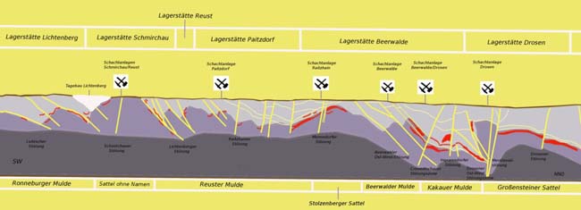 Lehmtagebaue Die Tagebaue zur Sand- und Lehmgewinnung dienten bei den untertägigen Verschlämmungs- und Versatzprozessen zur Bereitstellung der Zuschlagstoffe. Die anfangs geringen Umfänge wurden aus kleineren Vorkommen gewonnen: